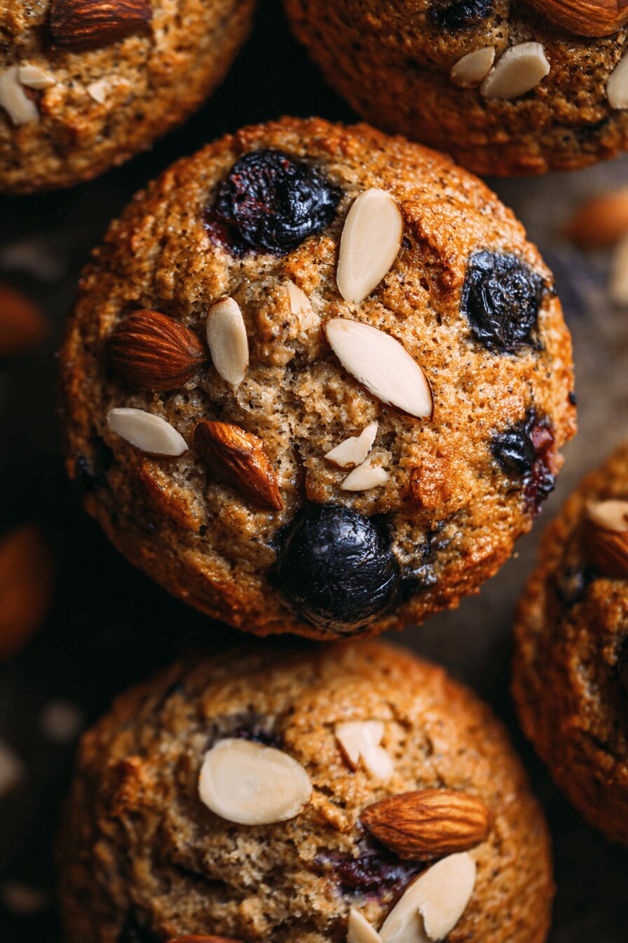 Muffins feitos com farinha de aveia e açúcar mascavo, combinados a maçã ralada e mirtilos frescos. A receita substitui a farinha comum por farinha integral e o iogurte grego por creme de ricota, além de trocar as amêndoas por nozes pecan picadas. Ingredientes secos e úmidos processados separadamente, depois misturados suavemente. Assados em forno médio por cerca de 20 a 28 minutos. Textura úmida e sabor equilibrado com toque crocante das nozes. Guardam bem por dois dias em embalagem fechada.