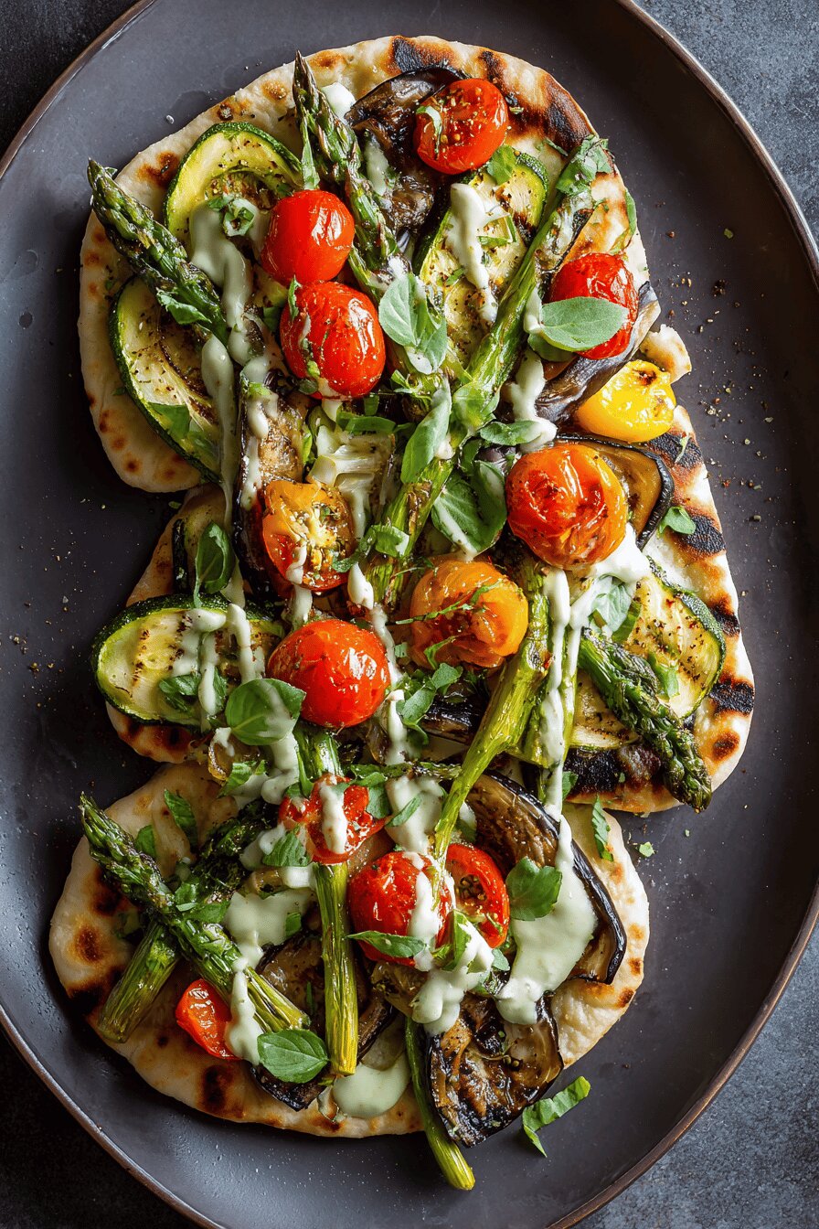 Pão naan com cobertura de legumes frescos e ervas, uma variação vegetariana sem nozes, que traz uma base cremosa cítrica de maionese e iogurte combinada com legumes delicados e crocantes. A mistura de abobrinha, aspargos e tomates cerisas dá textura e cor, com toque fresco do manjericão. Ideal para pratos rápidos, versátil e leve. Substituções inclusas e dicas para garantir legumes no ponto e pão macio. Tudo numa pegada fácil, sem complicação nem tempo exato demais. Acompanhamento clássico de churrasco veg ou lanche diferente.