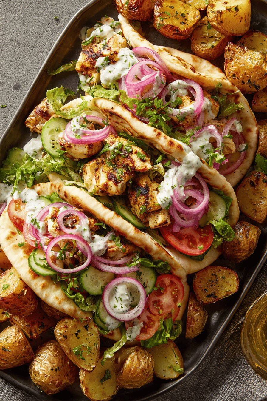 Sanduíche de pão naan recheado com frango marinado em especiarias tipo shish taouk, acompanhado de batatas assadas com ervas frescas e molho cremoso de alho. Inclui ainda fatias crocantes de pepino marinado rápido, tomate e cebola roxa equilibrando texturas e sabores. Preparação envolve técnicas simples mas atenção aos tempos e pontos certos para evitar frango seco ou batata mal assada.