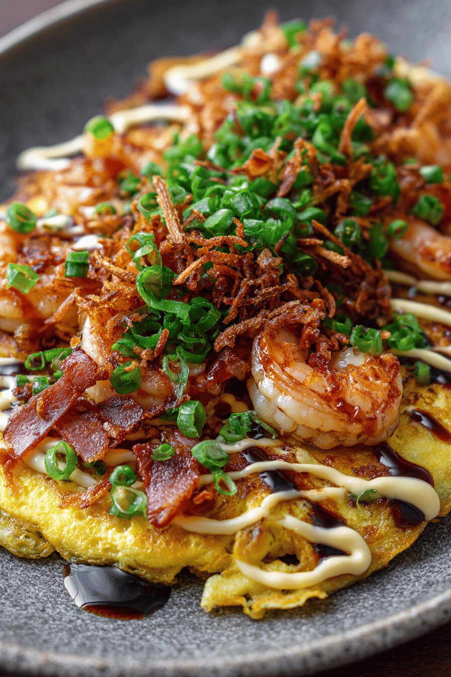 Misturar ingredientes deve ser feito até a massa ser lisa, respetar ordens ajuda na textura. Refogar com calma até o repolho quase transparente e bacon dourado, camarão rápido pra não endurecer. Ajustes de fogo pra não queimar a frigideira, limpar rápido para fazer a omelete sem sujeira. Massa espalhada uniformemente para ficar grossa e firme. Virar com espátula larga, bem devagar pra não quebrar. Cortar quente, rápido, para que os flocos de bonito “dancem”. Molho e maionese por cima, não na frigideira para manter sabor e textura. Servir sempre na hora, a experiência do prato está na temperatura e na textura viva.