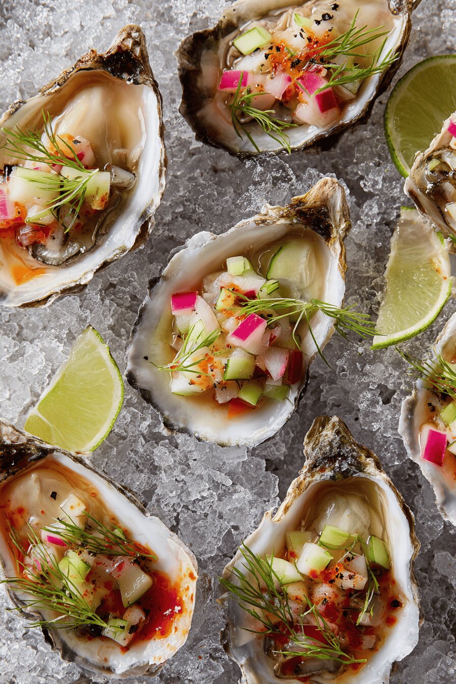 Ostras frescas servidas com uma mignonnette de legumes agridoce feita com vinagre de maçã, ervas frescas e um toque de xarope de bordo. A receita inclui rabanete e pepino picados finamente, com pimenta rosa substituindo o preto tradicional, dando um aroma mais leve. Servidas sobre gelo triturado, regadas com molho tipo Tabasco e acompanhadas de limão siciliano cortado em gomos. Sem glúten, leite, ovos e nozes. Fácil, rápido, com sabor que brinca com o azedo, doce e picante em equilíbrio. 24 porções em 35 minutos.