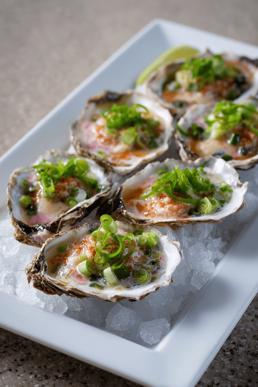 Ostras frescas servidas com molho cremoso feito de leite de coco, creme azedo, capim-santo e limão, com um toque marcante de molho de peixe. Ideal para quem curte sabores tropicais e refrescantes, sem complicação. O molho, filtrado para textura leve, revela aromas cítricos e herbais intensos. As ostras ficam sobre camada de gelo triturado garantindo a temperatura certa, realçando o frescor e a textura delicada dos moluscos. Rápido, econômico e versátil, ótimo para entrada em reuniões ou jantar informal. Pode substituir creme azedo por iogurte natural, e o capim-santo por folha de limão kaffir se estiver na mão.