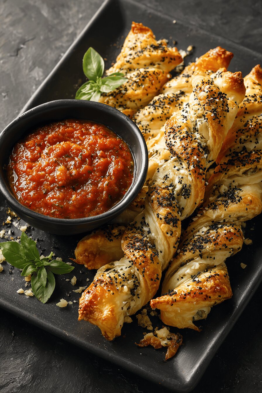 Um aperitivo vegetariano sem nozes, que mistura dois tipos de queijo e uma pequena reviravolta na massa folhada, criando uma textura crocante e sabor complexo. Fácil de preparar, serve com molho marinara quente, combinando toque ácido e cremosidade. O formato em sol, com seus raios torcidos, oferece uma apresentação visual atraente, ideal para momentos de confraternização ou petiscos improvisados. Ao alternar queijos e sementes, garante um sabor surpreendente e textura agradável sem complicação.