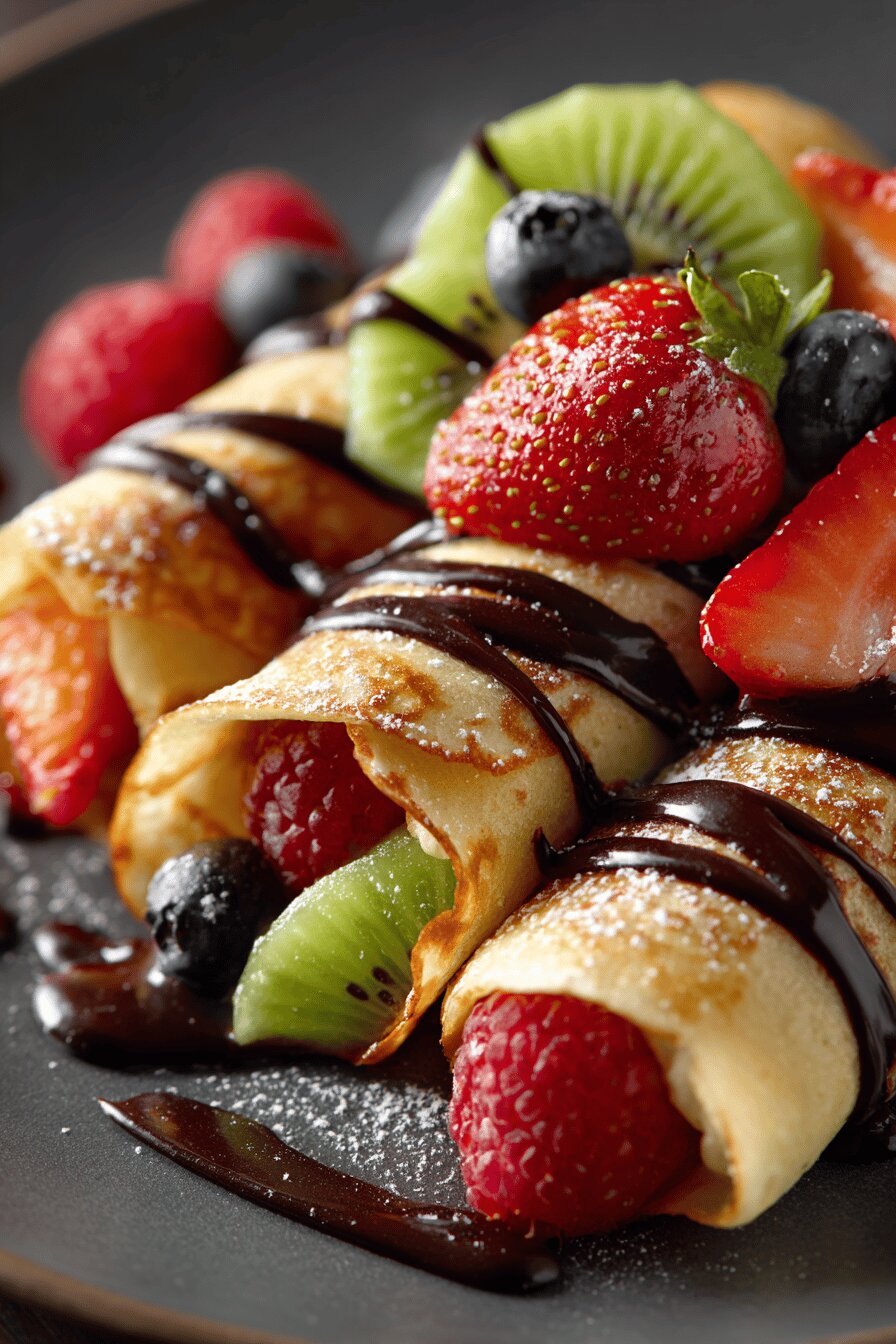 - 💡 Aquecendo chocolate no micro-ondas, atenção! Mexa a cada intervalo. Não deixe queimar. Se preferir, faça em banho-maria. Controle a temperatura. A montagem ajuda. Enrolar panquecas e colocar frutas por cima. Um toque visual e saboroso. Sirva logo para o melhor sabor.
