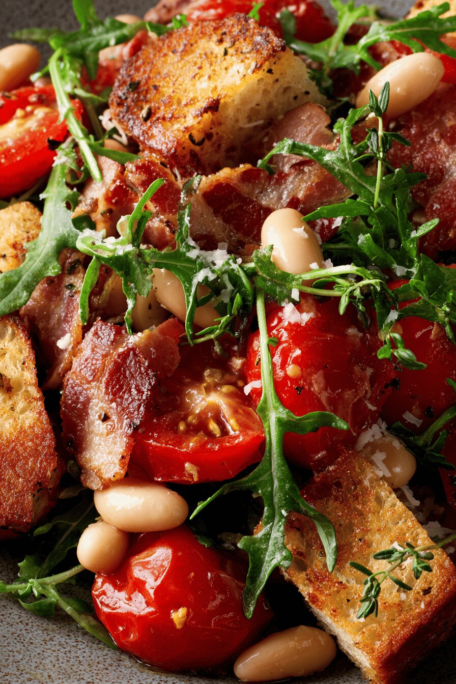 Salada rústica com pão crocante, feijão branco, bacon crocante e tomate docinho. Mistura ácido do vinagre com mel, textura da rúcula e toque cremoso opcional do queijo ricota. Variação com cebola roxa e limão para acidez diferente. Pra fazer no forno, bacon separadamente pra ficar no ponto e tomate amassando devagar. Tudo longo o bastante pra crocância e sabor mas não seca. Muito fácil, mistura quente e fria, um tanto crocante, cheio de sabores.