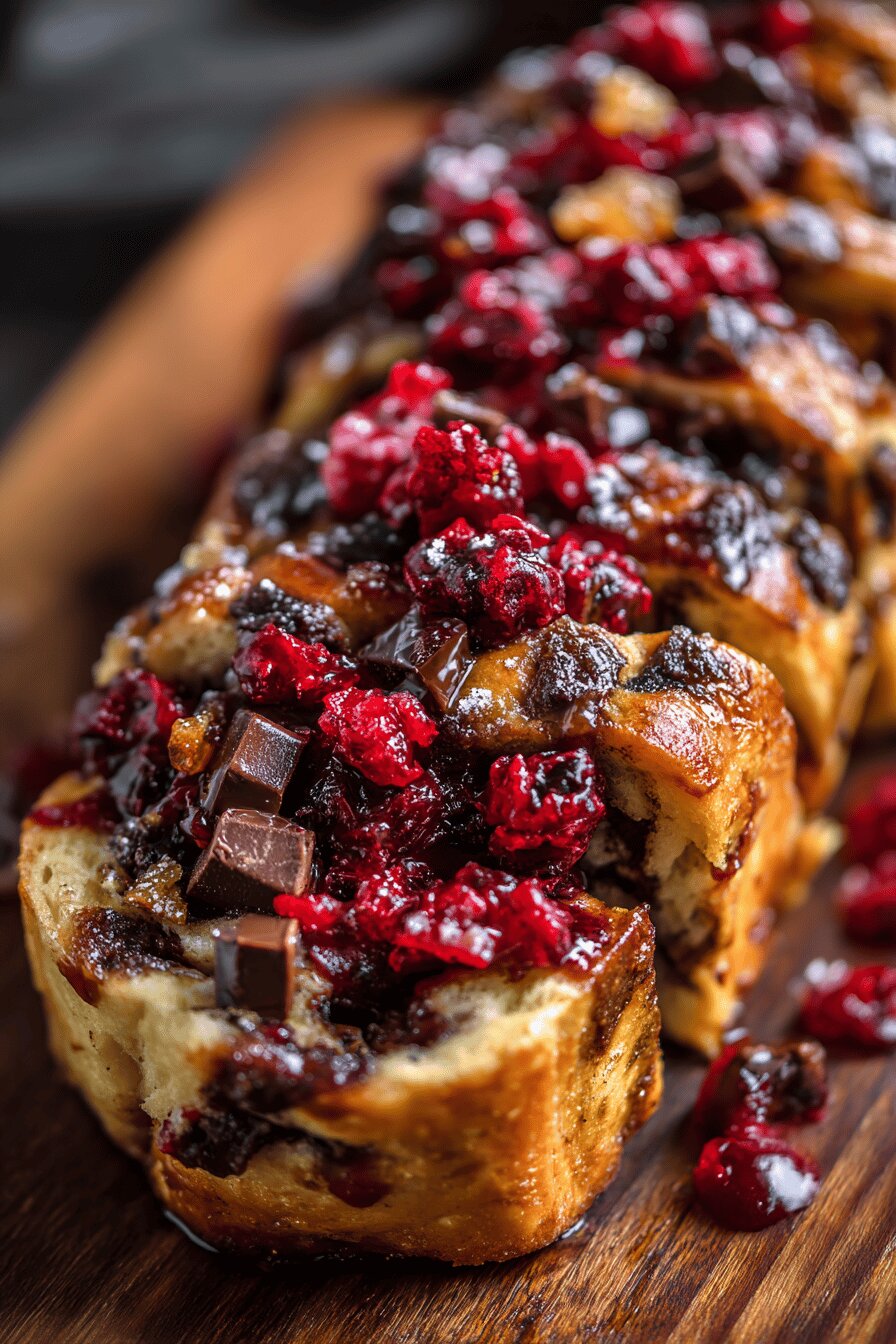 Pão doce fermentado com pedaços de chocolate meio amargo e gengibre cristalizado, recheado com cana-de-açúcar e frutas vermelhas. Massa úmida, macia e pegajosa. Leve toque cítrico das framboesas e picância do gengibre. Receita adaptada com fermento biológico seco e açúcar mascavo na massa. Ideal para café da manhã, lanche ou sobremesa compartilhada. Assado em forma retangular, fatias que se desgrudam facilmente. Tempo total ao redor de 1 hora e 30 minutos entre preparo e fermentação. Serve entre 6 a 8 pessoas. Textura fofa, com notas marcantes do chocolate amargo e doce da geleia caseira. Sem castanhas, vegetariano.