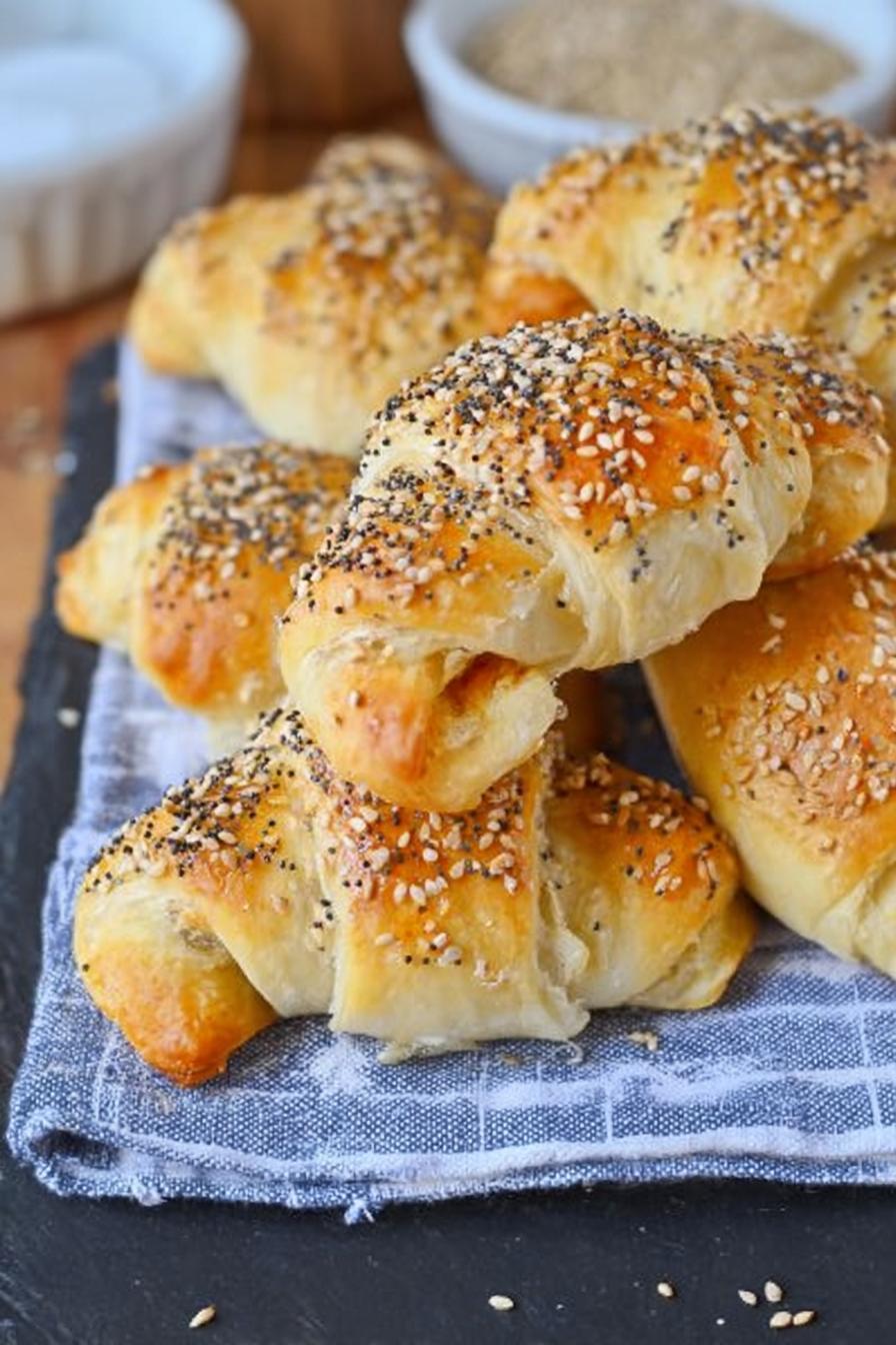 Pãezinhos folhados feitos com massa crocante e recheio cremoso de cream cheese e queijo muçarela ralado. A superfície ganha um toque aromático com tempero de ervas e sementes variadas. O ovo pincelado dá brilho e ajuda o tempero grudar. Receita rápida, fácil, que pede atenção para enrolar a massa e identificar o ponto certo de forno vendo as bordas dourando e o cheiro que sobe.