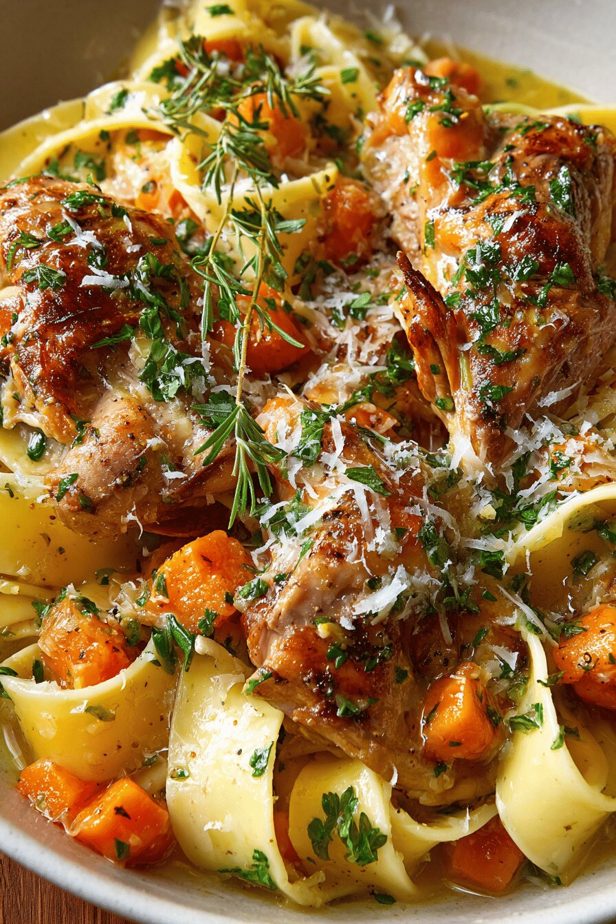 Coelho cozido lentamente com legumes, vinho branco e ervas, servido com pappardelle caseiro. Troca vinho branco por cachaça, farinha branca por farinha de milho fina. Ervas frescas como manjericão e coentro substituem alecrim e tomilho. Tudo cozido em fogo baixo. Massa cozida al dente, misturada direto na panela com o molho espesso e pedaços desfiados de coelho. Parmesão ralado por cima, final frescor do cheiro verde.