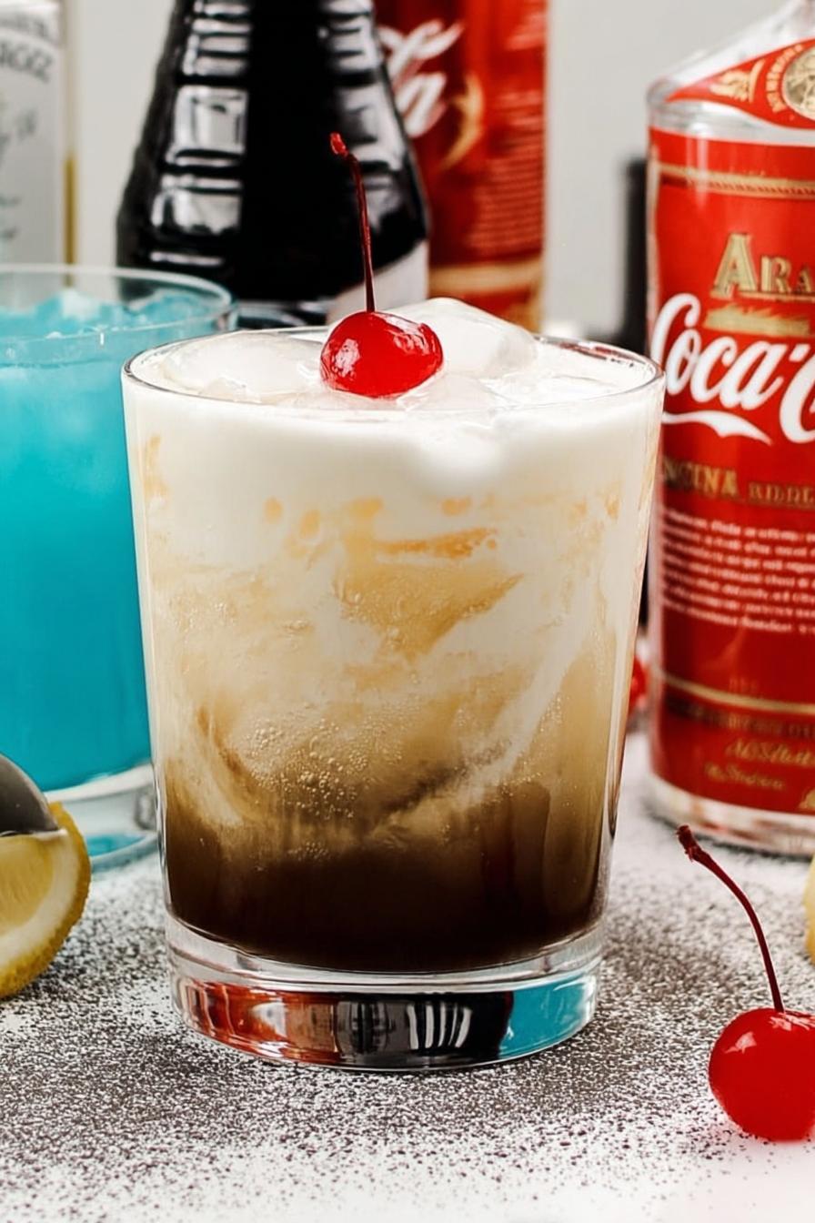 Gelo é crucial, sem ele o drink dilui rápido e perde corpo. Prefira cubos grandes, que derretem devagar. O licor de café pode ser substituído por uma mistura forte de café espresso com um xarope simples e um toque de rum escuro, para aproximar o sabor. Vodka aromatizada com baunilha traz um elemento a mais, mas vodka comum não compromete demais se não tiver. Refrigerante cola tradicional, nada de versões zero ou light – o açúcar ajuda na textura e na camada. Sobre o creme de leite, uso o fresco por causa da densidade que cria camadas melhores, mas em apuro serve o de caixinha integral – só tem que prestar atenção se não for muito ralo. Cereja marasquino é aquela cereja clarinha, doce e bizarra, mas complementa a estética e um toque frutado.