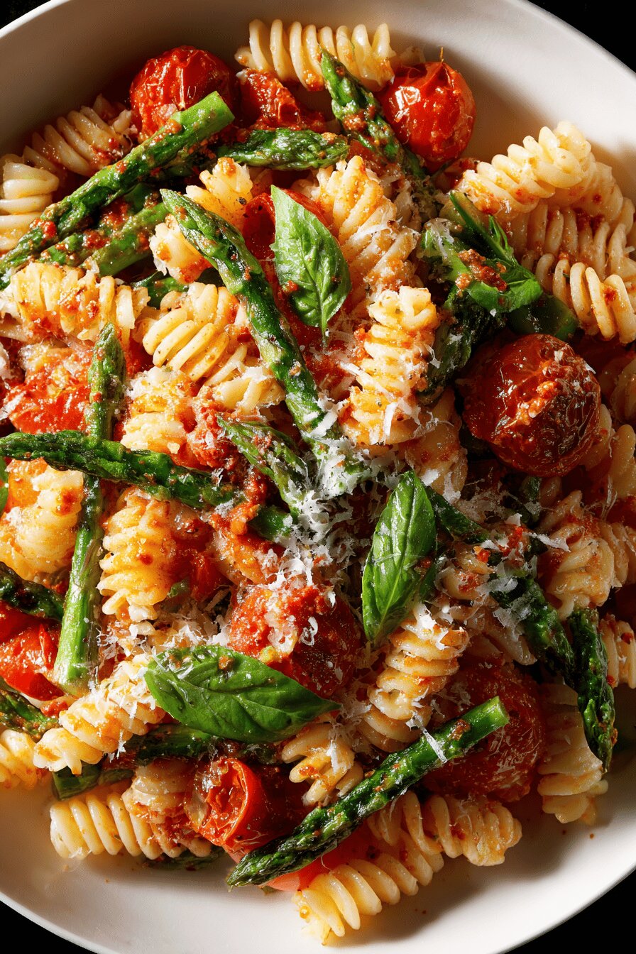 Massa curta com pimentões vermelhos assados lentamente até amaciarem e ganharem doçura, combinada com aspargos crocantes, alho e cebola refogados em azeite. Toque de pasta de harissa para um leve calor e notas defumadas, equilibrado com queijo parmesão. Receita vegetariana, sem lactose, ovos ou nozes, com substituições práticas para ingredientes e truques para texturas ideais.