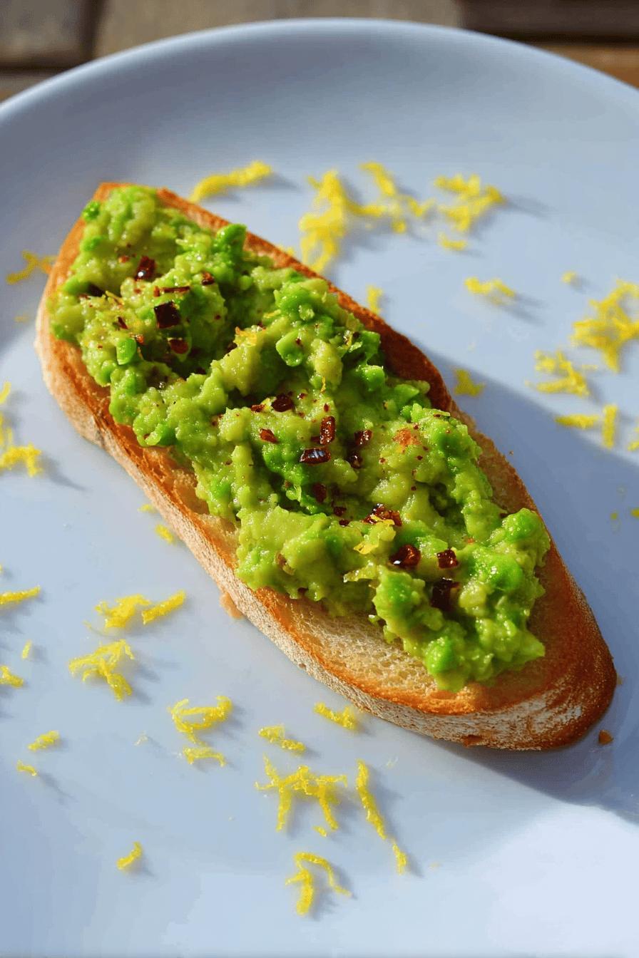 Pasta cremosa feita com ervilhas, alho e salsa cozidas suavemente, finalizada com raspas e suco de limão siciliano, azeite extra virgem e pitada de pimenta vermelha. Serve para barrar em crostinis ou torradas crocantes. Versão levemente adaptada com hortelã no lugar da salsa e substituição parcial do azeite por óleo de abacate para um toque menos agressivo. Bom para petiscos rápidos, entradas ou acompanhamentos refrescantes.