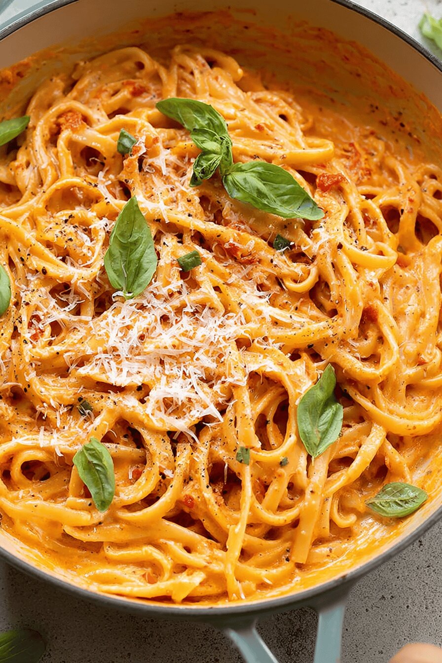 Linguini com molho feito de tomate cereja e pimentão vermelho assados, combinados com uma base cremosa de creme de leite fresco e chalotas refogadas. O resultado tem textura rústica, cor vibrante e sabor que mistura o adocicado, a leve acidez e o toque de pimenta. Serve seis. Técnica envolve assar vegetais para intensificar aroma e sabor, processar para molho a meia textura, finalizando com parmesão e manjericão para frescor.