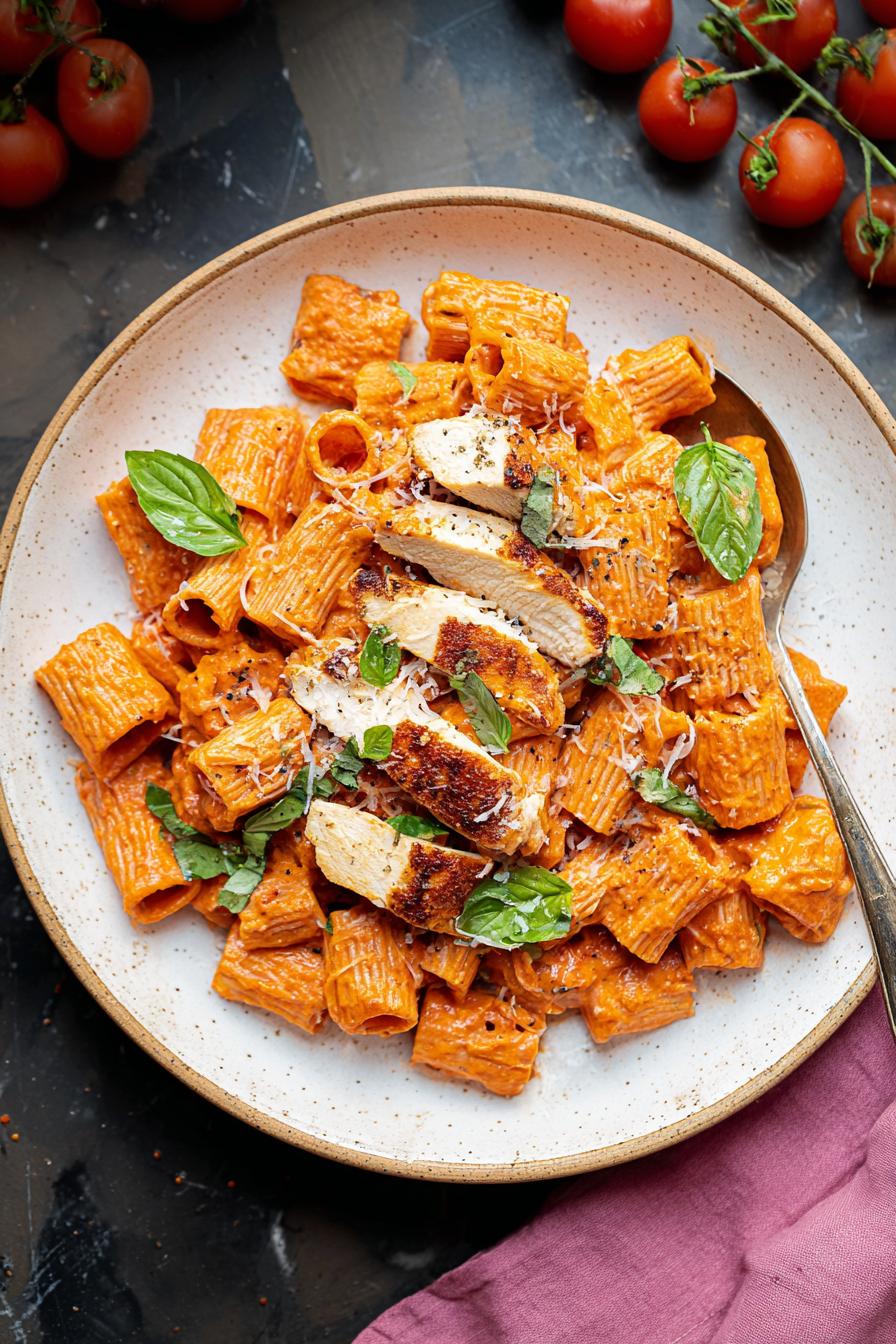 Frango temperado e dourado, massa al dente e molho típico à base de tomate com vodka, creme de leite e pimenta calabresa. A receita equilibra acidez, picância e cremosidade, com toque herbáceo do manjericão. Ideal para variar o clássico molho vermelho, usa pimenta dedo-de-moça no lugar dos tradicionais calabrian peppers e um pouco de queijo pecorino em vez de parmesão, dando personalidade brasileira à receita italiana. Serve bem de 4 a 6 pessoas, rápido na cozinha, resultado pra quem gosta de sabor marcante e textura aveludada.
