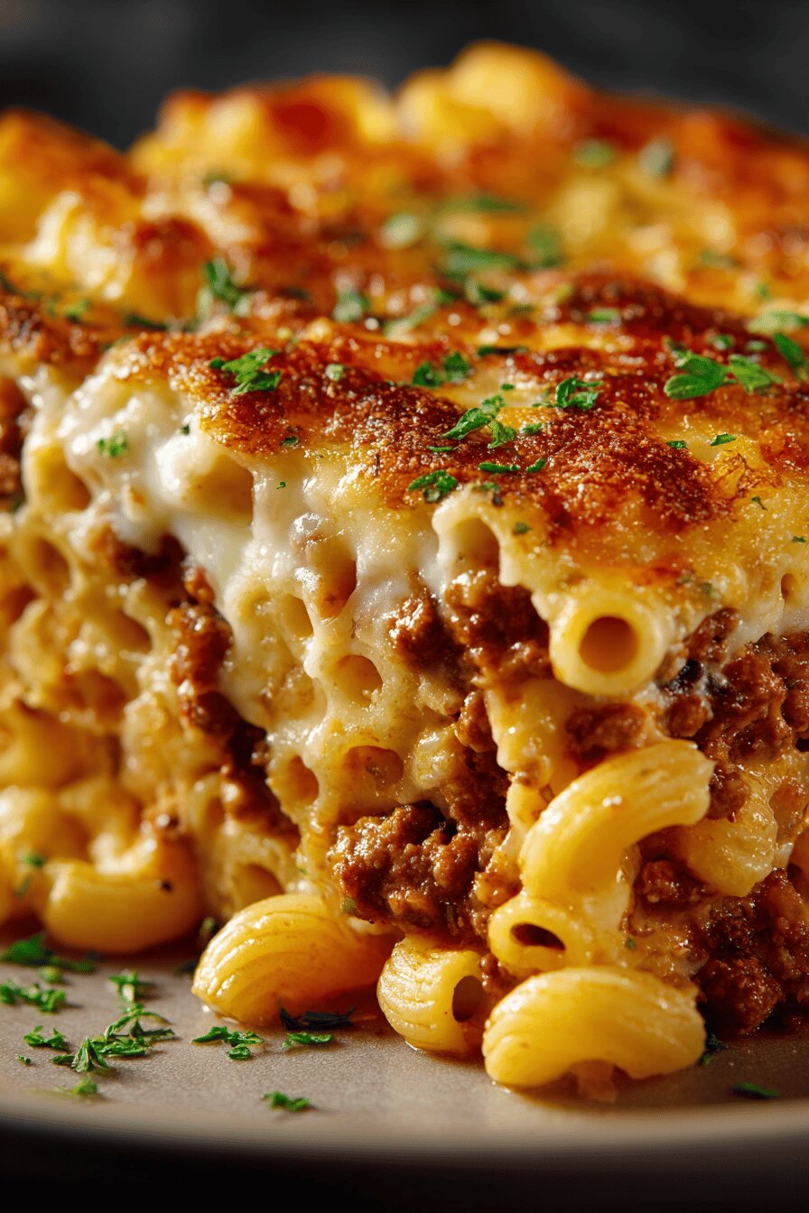 Variante do pastel italiano grega, o pastitsio leva carne moída, molho à base de tomate e uma camada cremosa feita com molho béchamel. A receita foi adaptada para alterar as quantidades de ingredientes, substituindo dois itens para dar um toque brasileiro, como o uso de queijo Minas padrão no lugar do pecorino romano e o vinho tinto por suco de jabuticaba. Passos reorganizados, tempos ajustados levemente para melhor sabor e textura. A massa é cozida al dente, com mistura da béchamel para incorporar, depois coberta pela carne e finalizada com mais molho. Repouso final para acomodar as camadas antes de servir, garantindo cremosidade na hora da degustação.