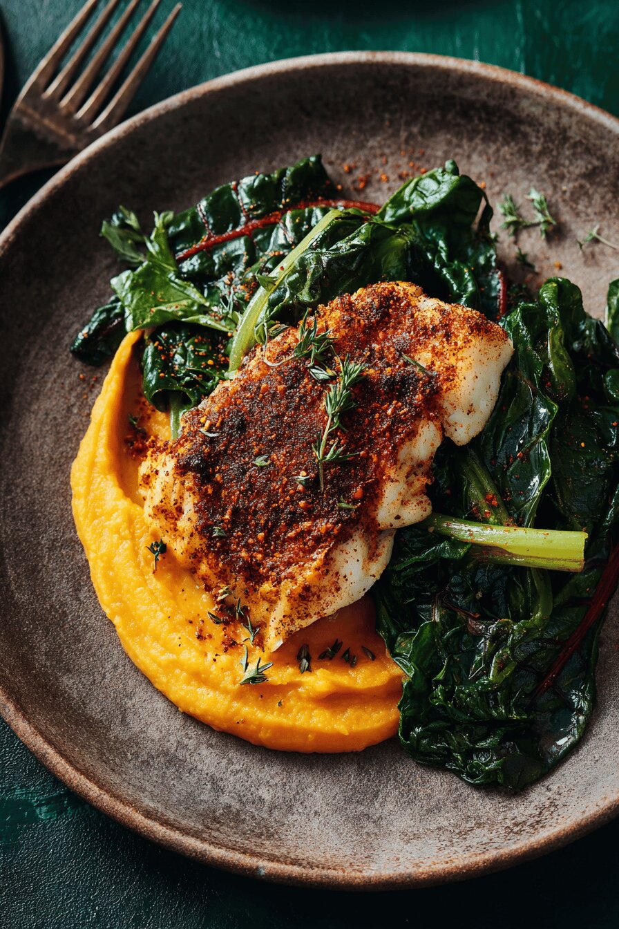 Peixe branco temperado com especiarias tostadas, servido sobre purê de cenoura cremoso e folhas verde-escuras. Sem glúten, lactose, ovos e nozes. A combinação de texturas e cores é vibrante. Temperos como páprica doce, pó de alho e um toque de açúcar equilibram o sabor do peixe. A beterraba é substituída pela couve manteiga para um tom mais amargo e firmeza na mordida. Técnica simples, porém exige atenção à textura do peixe e purê para não perder a suculência e o frescor natural. Ensinamentos de cozinheiros experientes ajudam a evitar erros comuns, como peixe ressecado ou purê aguado.