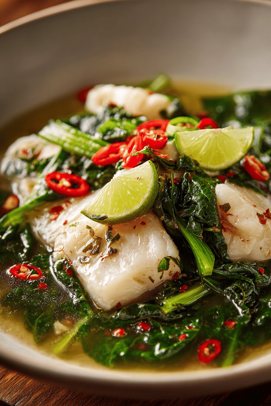 Peixe branco cozido no vapor com acelga refogada e caldo aromático de gengibre, alho e especiarias orientais. Receita que mistura sabores cítricos, salgados e picantes, com toque fresco e textura leve. Fácil de preparar, ideal para quem busca alimento saboroso sem lactose, ovos ou nozes, com preparo rápido e resultado nutritivo e equilibrado.