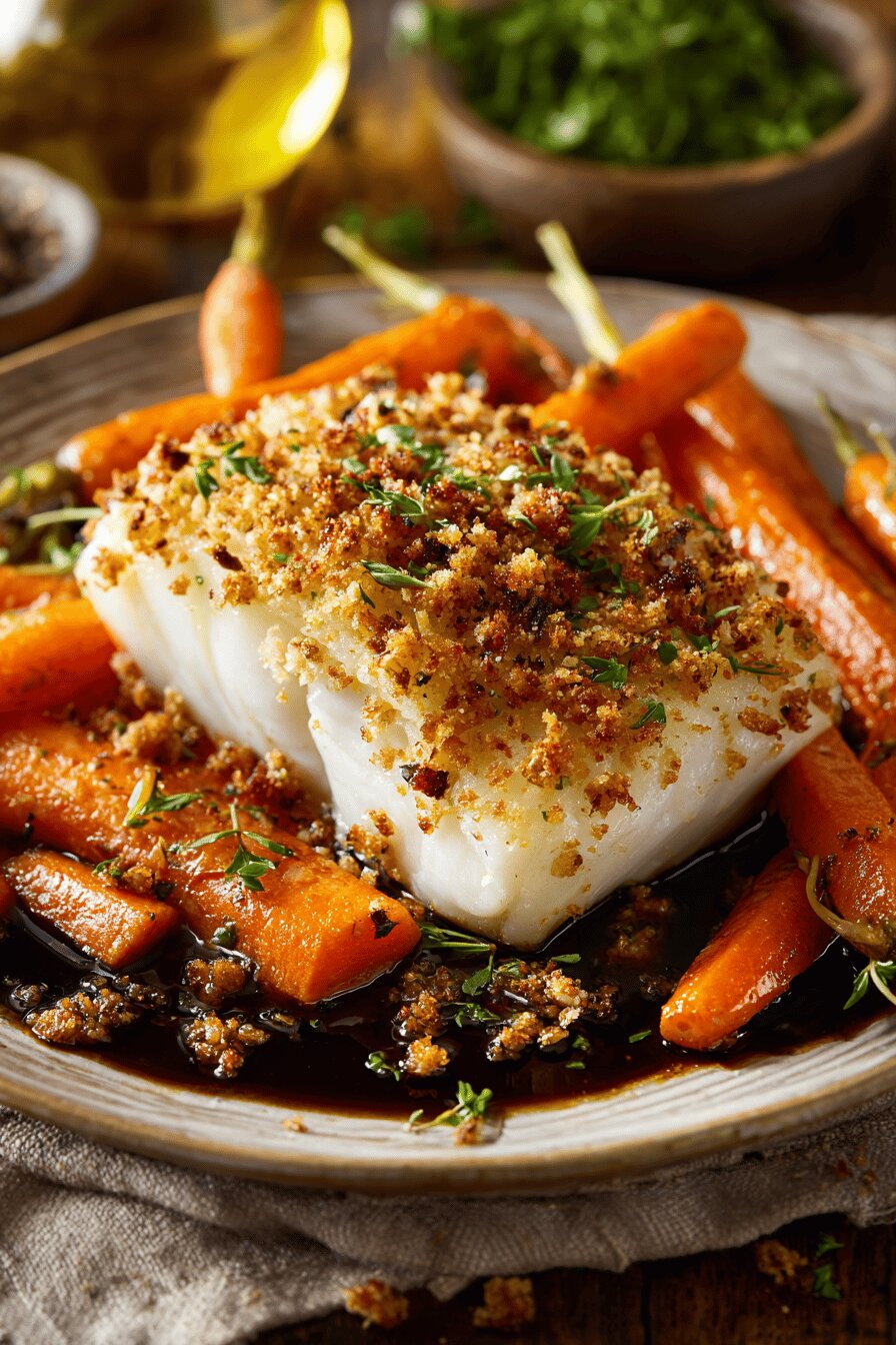 Peixe branco coberto com crosta crocante de pão temperado com pimenta da Jamaica e alho; servido sobre cenouras glaceadas ao mel e vinho tinto. Fácil de ajustar ingredientes e tempos conforme o peixe e textura desejada. Combina técnicas francesas com toques pessoais e atenção ao ponto de cozimento, realçando sabores sem lactose, ovos ou nozes.