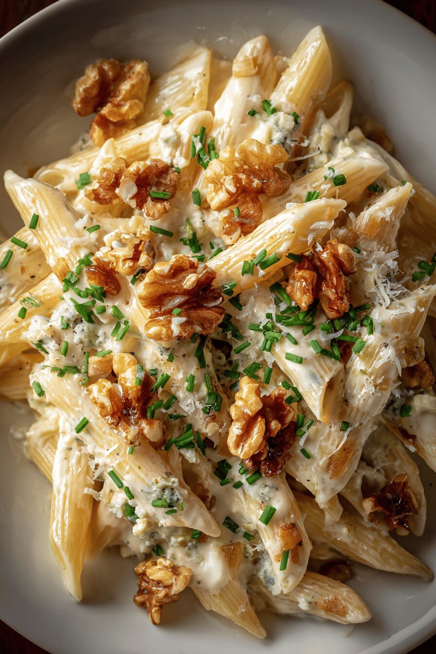 Massa curta cozida al dente envolta em molho cremoso de queijo gorgonzola dissolvido no vinho branco com toque de creme. Nozes tostadas adicionam crocância e aroma, finalizadas com queijo parmesão ralado na hora e ervas frescas. Receita vegetariana, sem ovos, que oscila entre sabores intensos e textura rica, ideal para quem curte queijos azulados e contrastes interessantes.