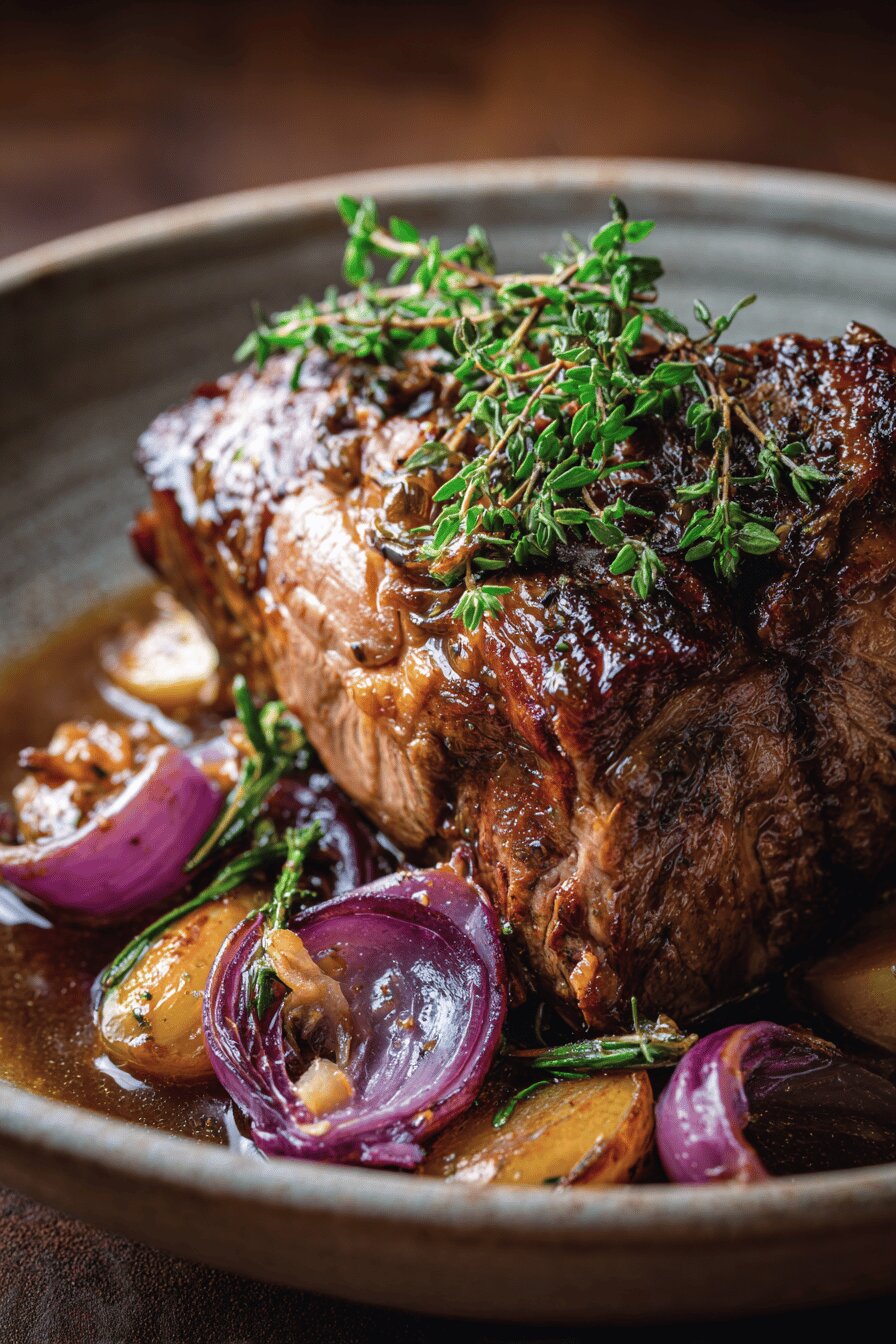 Comece pré-aquecendo o forno para garantir temperatura constante — é chave para a textura final. Use uma faca pequena para fazer incisões no pernil e coloque fatias de alho para infundir sabor. Selar a carne é passo obrigatório: não só cor, mas fechamento dos sucos internos. Depois, na mesma panela, dourar a cebola para ganhar aroma, evitando lavar, mantém aroma e sabor acumulado. Cenoura entra junto para adoçar e dar textura no líquido de cozimento. Volte a carne, despeje o vinho - que vai deglacear o fundo da panela, puxando sabor. Por fim, coloque os ramos de tomilho e tampe bem. No forno baixa temperatura, sem pressa, quase nenhuma intervenção até o final — só paciência. Deixe repousar fora do forno uns 15 minutos para os sucos redistribuírem e a carne firmar levemente antes de cortar. Sirva com acompanhamento simples, que absorva o molho e traga conforto. Um prato que vale o tempo, pede calma e atenção mínima, mas resultado entrega festa na boca.