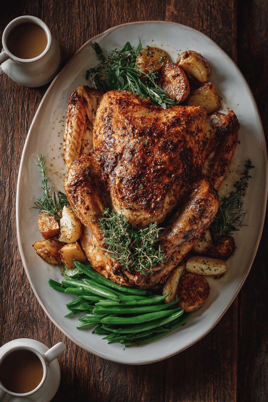 Peru assado com manteiga temperada, especiarias aromáticas e molho reduzido ao vinho. Receita adaptada para evitar alergênicos comuns como lactose e ovos, usando substituições e técnicas que garantem um preparo suculento e saboroso. Ajustes na salmoura seca e nos tempos de forno valorizam textura e sabor, com dicas práticas para reconhecer o ponto de cozimento pelo visual e temperatura interna. Molho rico feito com redução de caldo, vinho e tomate fresco, engrossado com amido, finalizado com toque de molho inglês e ervas. Receita para 10 porções, ideal para reuniões e celebracões.