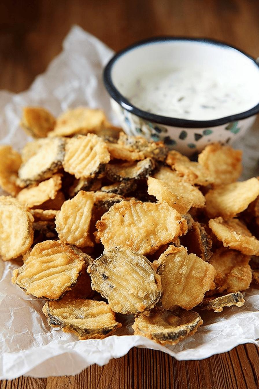 Finas fatias de picles mergulhadas em uma mistura líquida de suco de picles e ovo, depois envoltas em misturinha seca que leva farinha, amido e temperos. Fritas em óleo quente até dourar e ficar crocante. O segredo está em reservar o suco pra dar sabor e ajustar a mistura para uma crosta leve, garantindo que fique sequinho por dentro e crocante por fora. Uma pitada de pimenta caiena no molho cria um finalzinho picante que casa bem com o ácido do picles. Rápido, gostoso e excelente pra petisco ou acompanhamento.