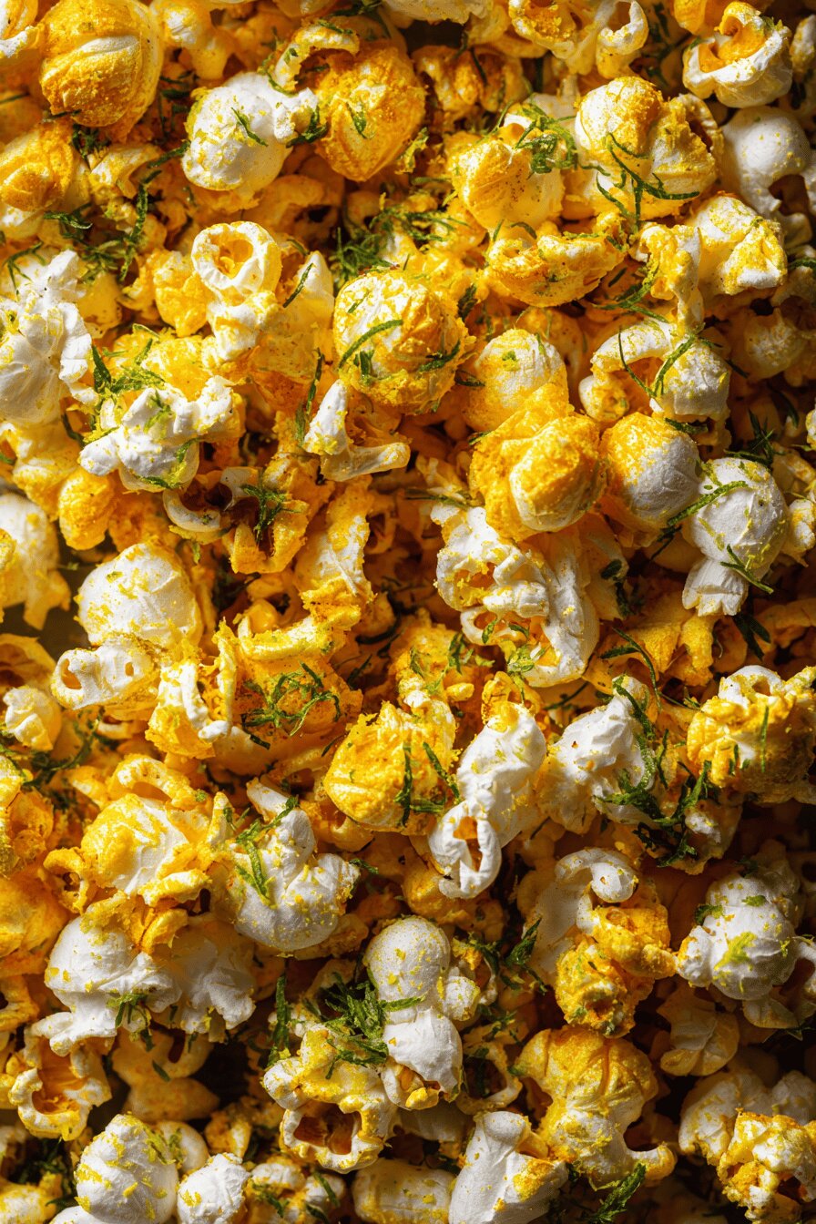 Pipoca feita com óleo de abacate, um toque de pimenta calabresa e cúrcuma para cor. Grãos de milho estourados na medida, temperados com levedo de cerveja e raspas de limão siciliano. Versão sem glúten, sem lactose, sem ovos e completamente vegana. Ideal para quem quer um snack com sabor vibrante e um leve toque picante.