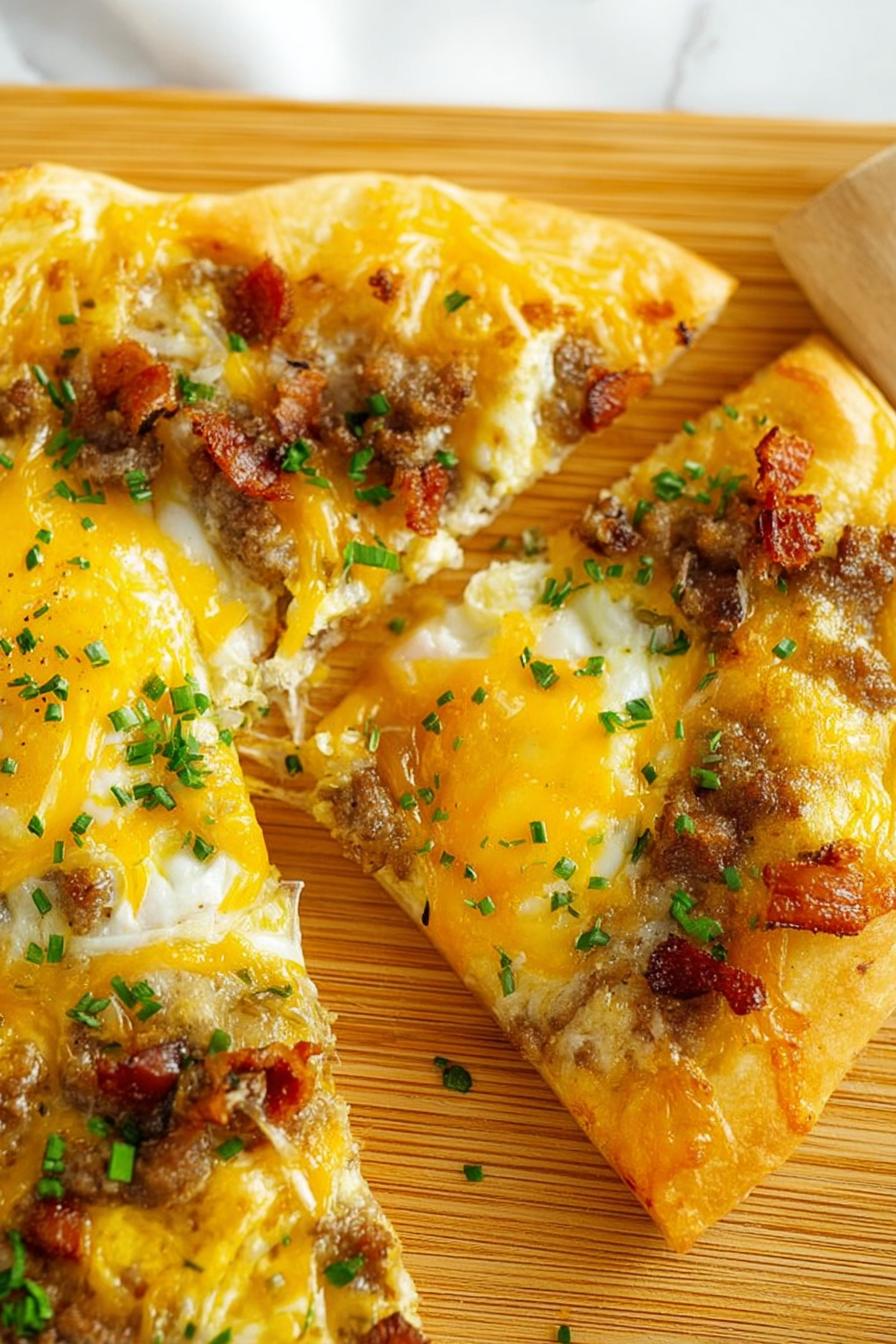 Uma pizza salgada para café da manhã que mistura massa rápida com recheio rico em proteínas e sabores clássicos americanos. Usa salsicha moída, bacon crocante, batatas rústicas e uma mistura cremosa de ovos com leite temperados com alho e cebola em pó. O queijo colby jack dá toque levemente amanteigado. Tudo assado até a borda dourar e o recheio firmar com textura quase de quiche. A crosta feita com massa de croissant refrigerada garante praticidade e leveza. Pode trocar o bacon por presunto ou o colby jack por mussarela, além de trocar o tipo de batata – sempre controlando a umidade para não deixar a massa encharcada.