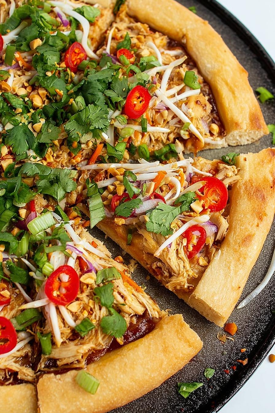 Pizza com toque tailandês usando molho satay de amendoim, frango desfiado, legumes crocantes e uma pitada de pimenta chinesa. Massa pré-cozida ganha sabor e textura ao tostar antes do recheio; camadas de ingredientes frescos e assados criam contraste de sabores. Finalizada com coentro fresco, cebolinha e amendoim torrado, hit na mistura de texturas. O molho satay leva gengibre fresco e um twist com açúcar mascavo claro, equilibrando o cítrico do limão e o salgado da soja. Pizza rápida, útil para usar sobras de frango e vegetais, com tempo total em torno de 25 minutos.