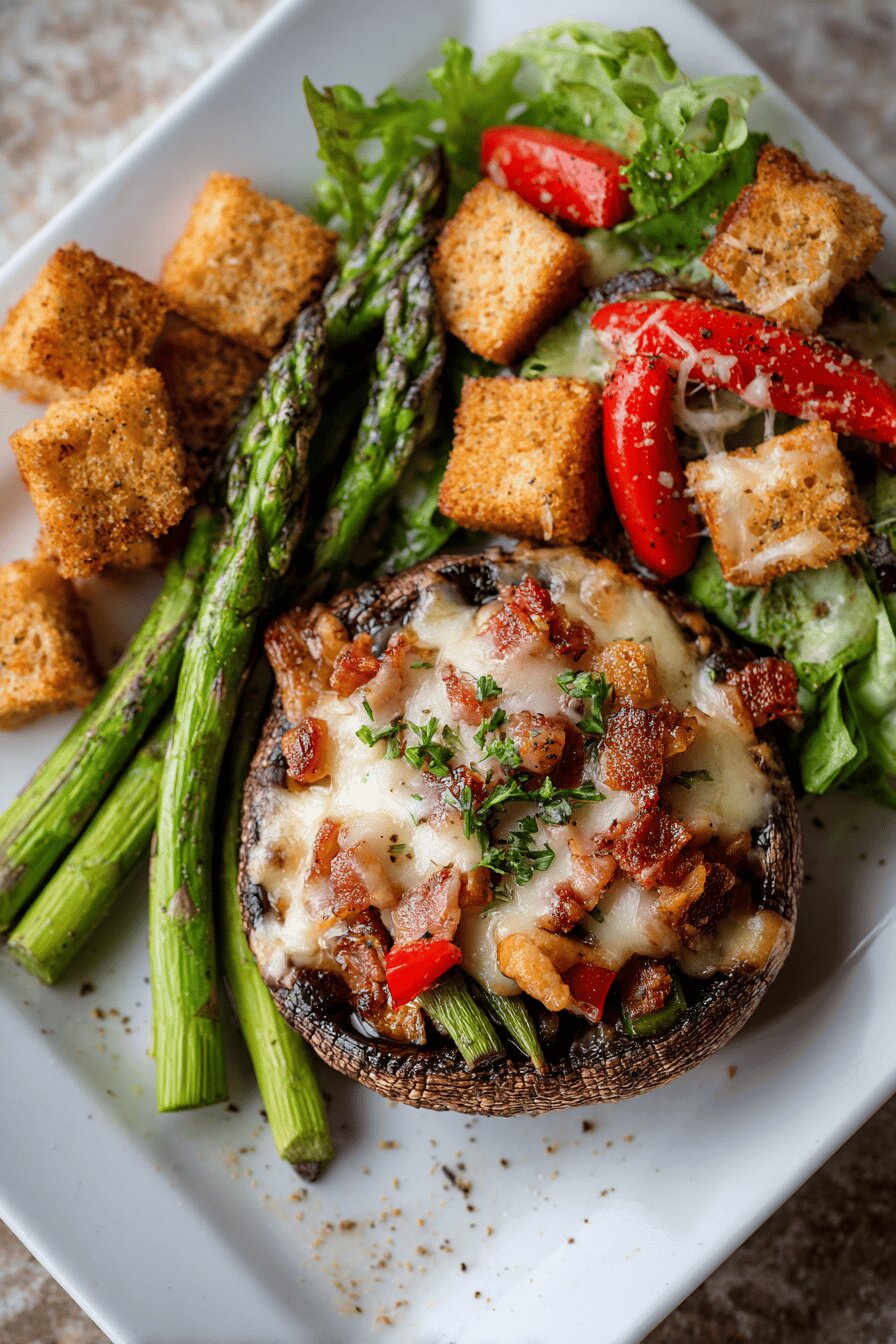 Cogumelos portobello recheados com bacon, aspargos, pimentão e queijo, marinados para intensificar sabor. Uma entrada versátil, que pode virar acompanhamento, mostrando textura cremosa e crocância delicada dos croûtons. Marinada com molho shoyu e toque de mostarda traz um fundo salgado e ligeira picância. Bacon deixa aroma irresistível; aspargos dão frescor. Queijo gratina criando crosta dourada, perfeito para servir quentinho, direto do forno. Substituições possíveis para quem não encontra algum ingrediente, ajustes simples para sabor adaptado sem perder a graça.