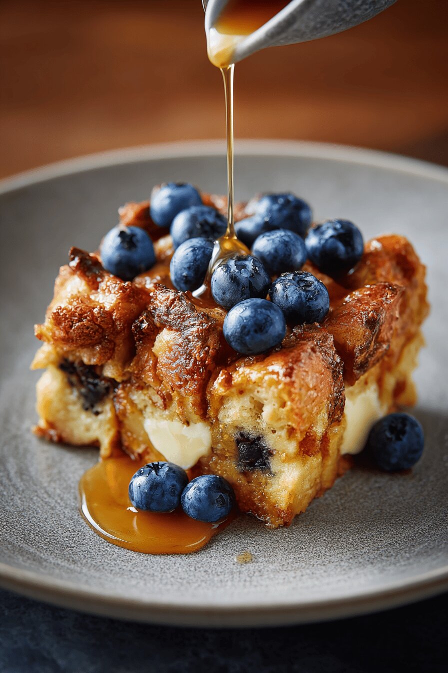 Um pudim de pão rústico com toque de especiarias e mirtilos frescos ou congelados, acompanhado de um molho quente feito com melaço de cana. Combina o conforto do pão embebido em leite com a acidez suave das frutas, finalizado com um molho encorpado que traz doçura e cremosidade. A farinha do molho é adicionada com técnica para não empelotar, o que exige atenção. O pudim é assado até firmar, ganhando uma crostinha dourada. Para adaptação, sugiro substituir a manteiga por óleo de coco e o leite por leite vegetal para versão vegana. O tempo e a textura falam mais que relógio, fique atento às bordas firmes e o meio ainda ligeiramente macio.