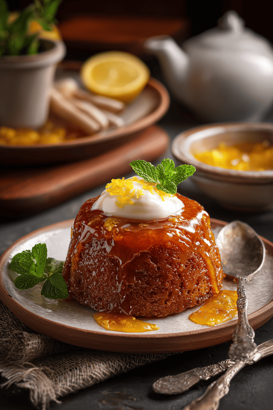 A farinha escolhida deve ser sem fermento, sempre; o fermento químico em pó aquece rápido, por isso doses precisas são cruciais para o pudim não virar uma esponja seca. Use manteiga amolecida, nunca derretida – isso faz toda diferença no resultado final do creme. Gengibre em pó dá o fundo do sabor, mas o fresco na calda é o que traz vida pro doce; substituí o açúcar por mel por questão de sabor, mas açúcar mascavo também funciona, só controle a quantidade para evitar amargar. A marmelada de laranja pode ser substituída por geleia de mexerica ou tangerina, depende da época, fica igualmente interessante. Caso não tenha limão siciliano, use limão cravo pois tem aroma mais forte, mas cuidado para não amargar a calda.