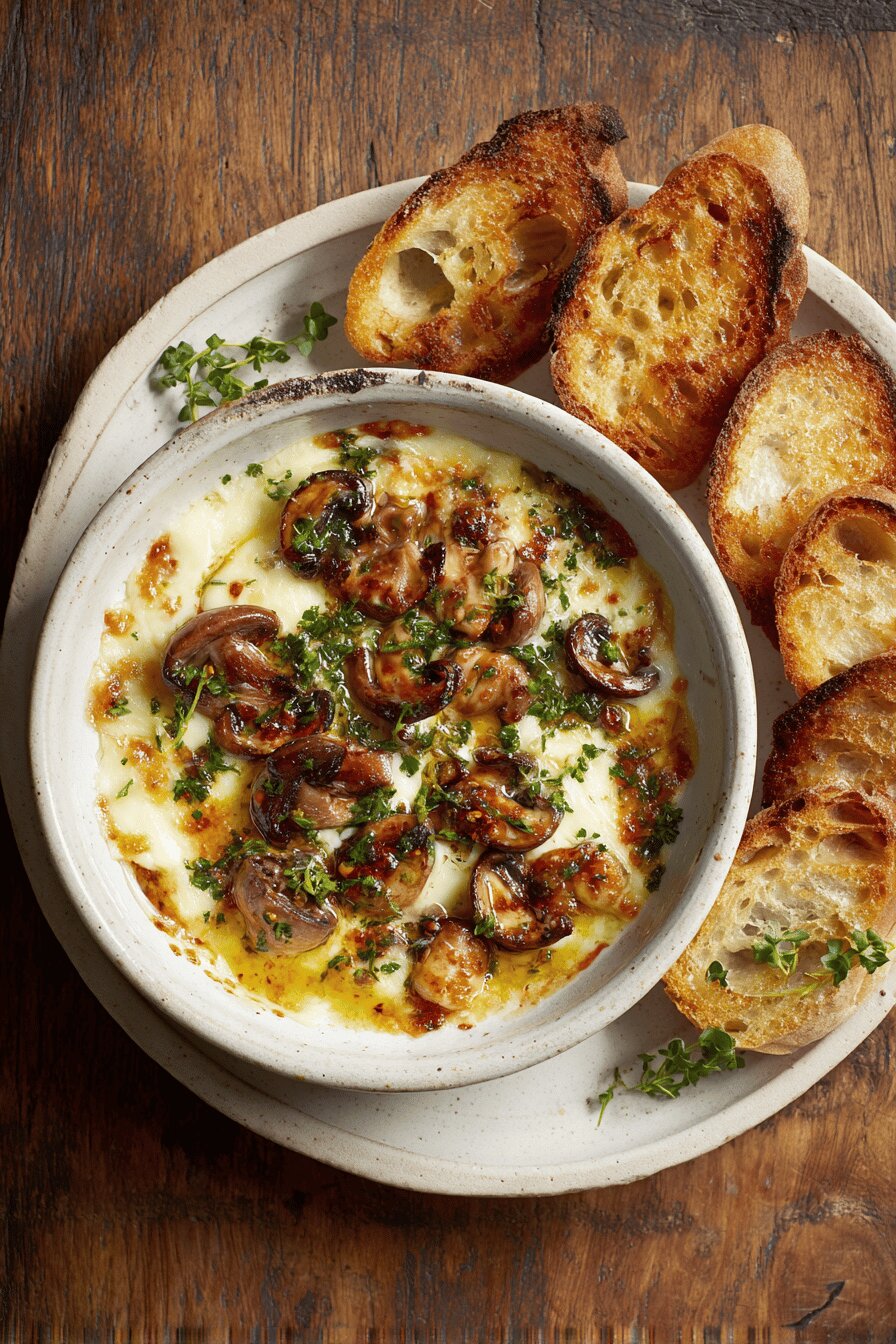 Queijo cremoso assado ao forno envolto em papel alumínio, coberto com mistura dourada de cogumelos variados, cebola roxa e temperos. Toque agridoce com molho simples de vinagre, mel e mostarda antiga para equilibrar. Textura cremosa contrastando com a crocância do pão tostado. Receita vegetariana, versátil, fácil de adaptar e servir como entrada numa noite informal ou aperitivo.