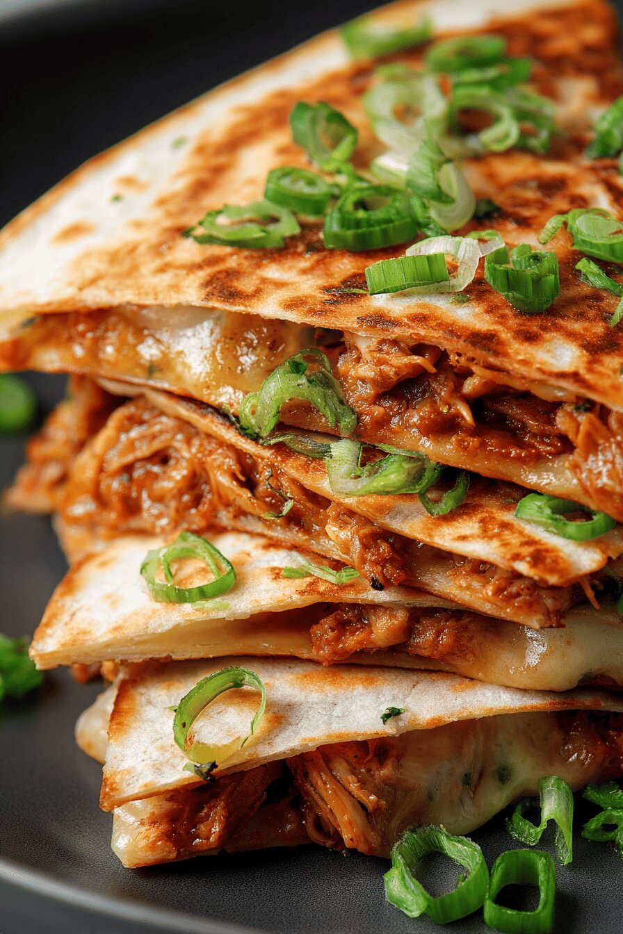 Começou aquecendo e desfiando carne no molho para absorver os sabores. A redução ajuda a carne ficar suculenta e não aguada. As cebolinhas tostadinhas depois são importantes para dar crocância e aroma, fazendo diferença no prato final. As duas frigideiras facilitam na hora de aquecer e dourar as quesadillas sem juntar tudo em uma só. O pincel para passar azeite deixa a tortilla crocante sem exagero. Distribuir os ingredientes cuidadosamente para facilitar fechar bem as quesadillas, evitando que tudo escape na hora de fritar. O tempo de dourar ajustado para 2-4 minutos depende do fogo, mas deve ficar bem corado e o queijo derretido. Servir logo após cortar, porque demora o queijo esfriar e perdemos a textura. Pode cortar ao meio ou em triângulos, fica a gosto. Trocar o coentro pelo manjericão deve acontecer no momento de montar para preservar frescor da folha, não cozinhar demais.