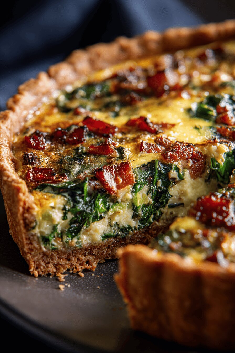Quiche salgada com base crocante, recheada com acelga e alho-poró refogados em vinho branco e bacon defumado. Massa feita com farinha integral, manteiga gelada e água gelada para textura quebradiça. O toque especial fica por conta do queijo minas e noz-moscada ralada na mistura de ovos com creme de leite. Assado até dourar e firme, perfeito para almoço ou lanche reforçado.
