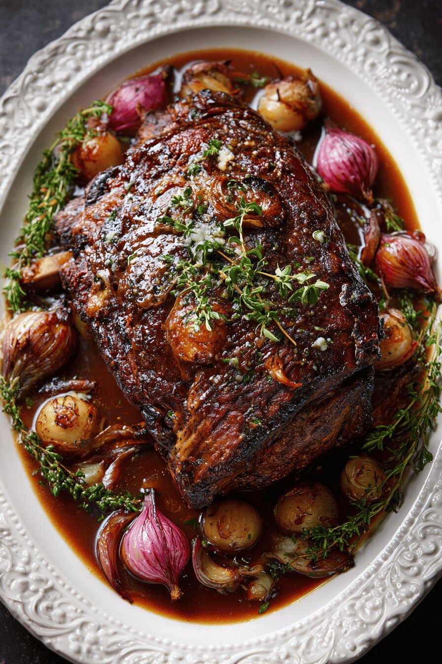 Uma variação do clássico assado de carne com cebolas caramelizadas e caldo saboroso. Substituí a manteiga por banha de porco para dar um sabor mais rústico, troquei a mostarda Dijon por mostarda escura para um toque mais agressivo e acrescentei tomilho fresco para aroma. Cozimento lento e baixinho para manter a carne úmida e dar chance dos ossos soltarem sabor no caldo. A textura da carne bem rosada interna e o caldo aromático fazem o prato que convida àquela purê de batata bem amanteigada. Fácil de adaptar e aplicar técnicas de temperatura interna para quem quer controle absoluto.
