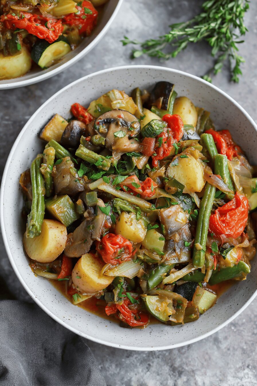 Um prato vegetariano que mistura batata com legumes típicos da ratatouille. Sem glúten, sem laticínios, sem ovos e sem nozes. A textura da batata traz uma resistência interessante, diferente do clássico. O cozimento envolve dourar e em seguida cozinhar em caldo vegetal, garantindo um sabor bem integrado e textura agradável, levemente al dente. Ideal para quem quer um prato principal leve e nutritivo.