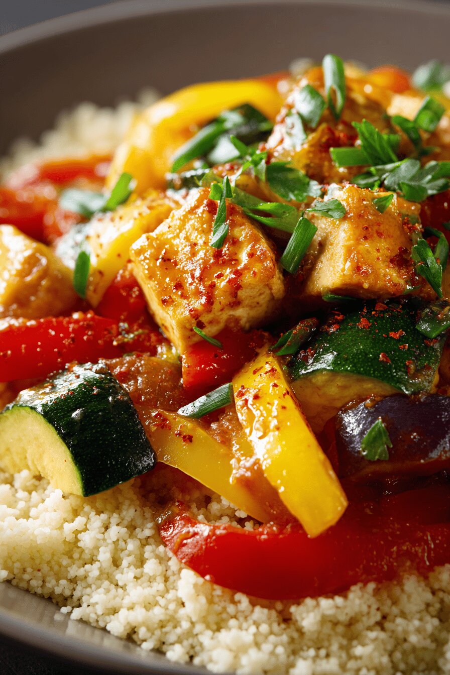 Legumes com texturas variadas colorem a frigideira. O cheiro do gengibre fresco invade o ambiente, enquanto o vinho branco evapora lento. Não é só ratatouille, é uma celebração da simplicidade do vegetal combinado com a proteína suave do tofu. Trocar o pimentão por berinjela dá um toque a mais de maciez. Tomate-cereja entra para adoçar e trazer frescor. Tudo confere camadas que se equilibram sem forçar o sabor. Refogar no óleo de coco entrega uma base diferente, mais exótica. Um prato vegetal que não tem pressa para ser apreciado mas causa impacto no sabor e aroma. Cores, aromas e texturas mesclam em uma receita que, embora longa, é simples e honesta para o dia a dia ou ocasiões especiais. Cozinhe direto na panela, pouco movimento e paciência. No fim, foge do trivial e ganha cara nova com poucas mudanças. Para servir, vai bem com couscous, arroz marroquino ou mesmo puro, só esse conforto vegetal quentinho na mesa.
