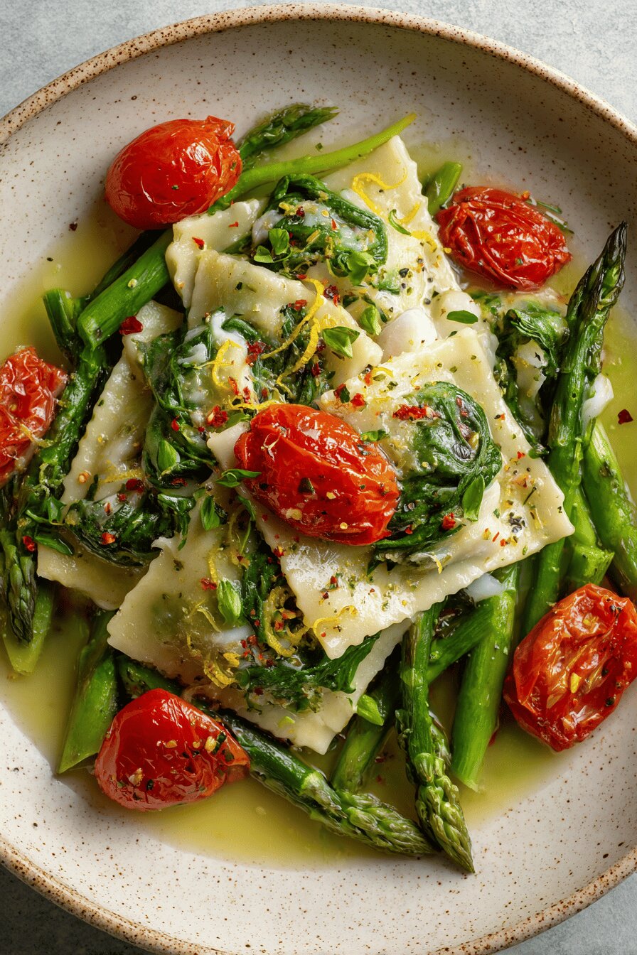 Massa verde feita com espinafre fresco, ovos e farinha, recheio cremoso de bacalhau em cubinhos com ricota e toque de limão siciliano. Finalizado com molho de manteiga, sálvia, aspargos crocantes e tomates cereja estourados. Técnica de abrir massa na máquina, montagem dos raviolis com água para selar e corte com roda canelada para textura rústica. Cozimento até flutuar, dando ponto ideal. Molho feito com manteiga dourada que ganha perfume herbáceo e umidade das verduras salteadas. Receita criativa, mantendo simplicidade e sabor marcante, ideal para impressionar sem complicação.