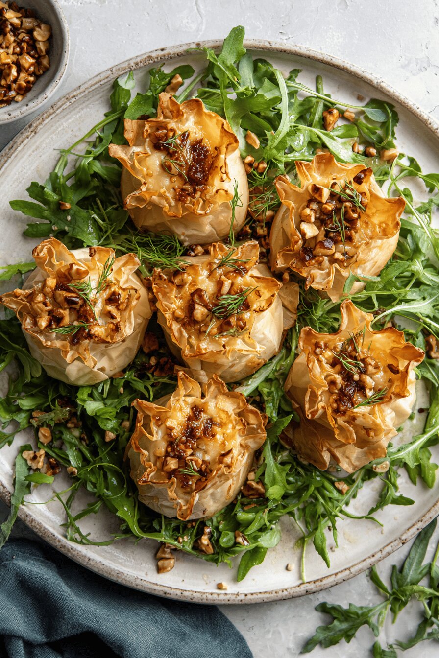 Entradas vegetarianas e sem glúten combinam maçãs salteadas e queijo reblochon dinamarquês sem crosta, envoltos em massa folhada crocante feita com folhas de massa brick. A receita usa noz-moscada, pimenta rosa moída e ervas finas para dar aroma e sabor. Finalizado com uma salada verde fresca temperada com molho ao limão, mostarda Meaux e oleaginosas tostadas. Delicadeza de texturas e sabores entre o cremoso, crocante e fresco, rápida para montar e assar, ideal para ocasiões especiais.