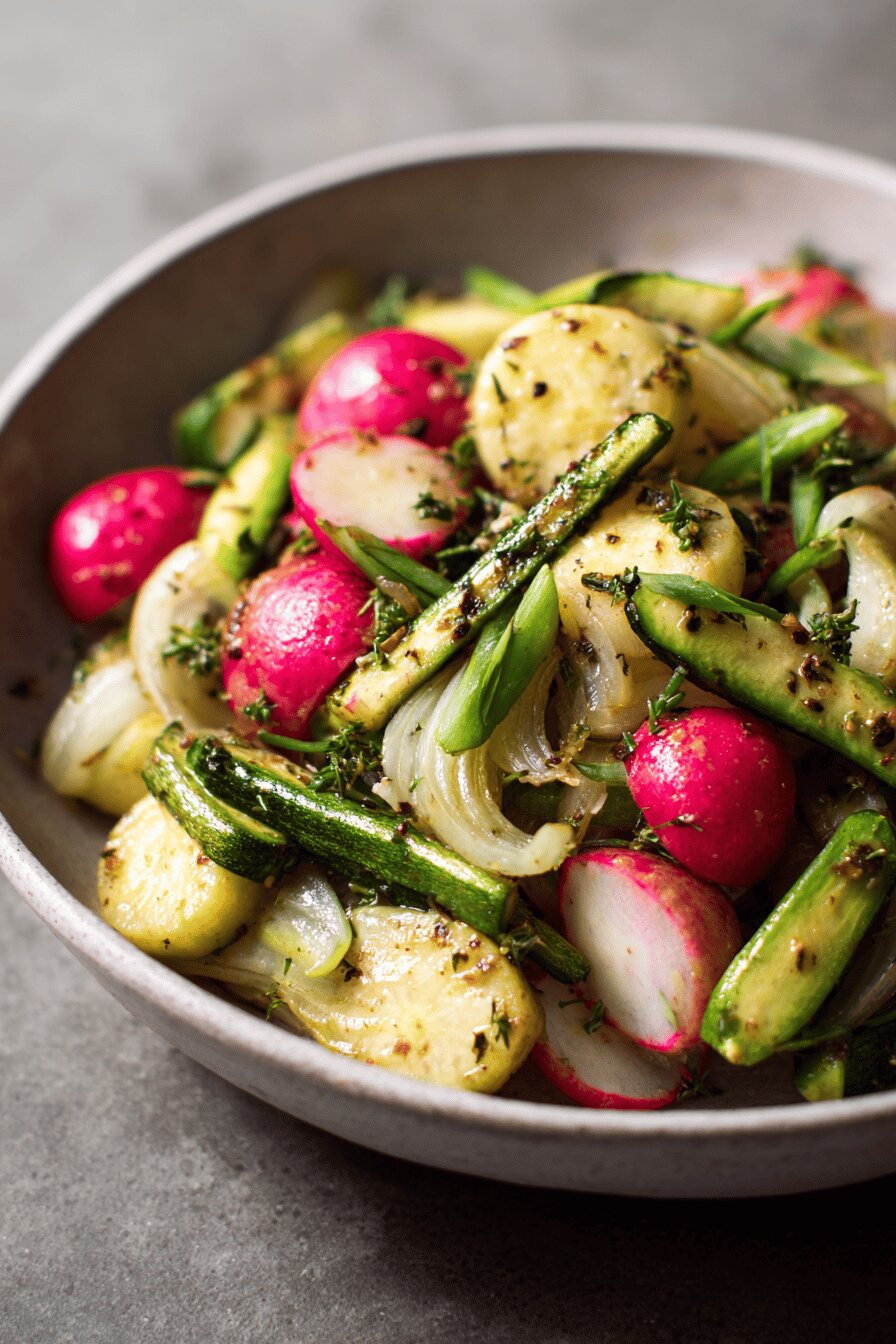 Um refogado leve e cheio de texturas, com rabanetes crocantes e abobrinha macia, temperado com alho, sementes de erva-doce e um toque de vinho branco. Versão vegana, sem glúten e sem lactose, simples e saborosa. A cenoura é substituída pela abobrinha para dar suculência e sabor neutro, enquanto o vinho branco se apresenta como alternativa ao porto, que nem sempre é fácil de achar. O segredo está no ponto de cozimento: rabanetes precisam ficar macios sem perder o croc, e a abobrinha deve dourar levemente. Finalizado com tomilho fresco, traz fragrância herbácea que casa bem com várias proteínas, fotos de apetites e cores vibrantes.
