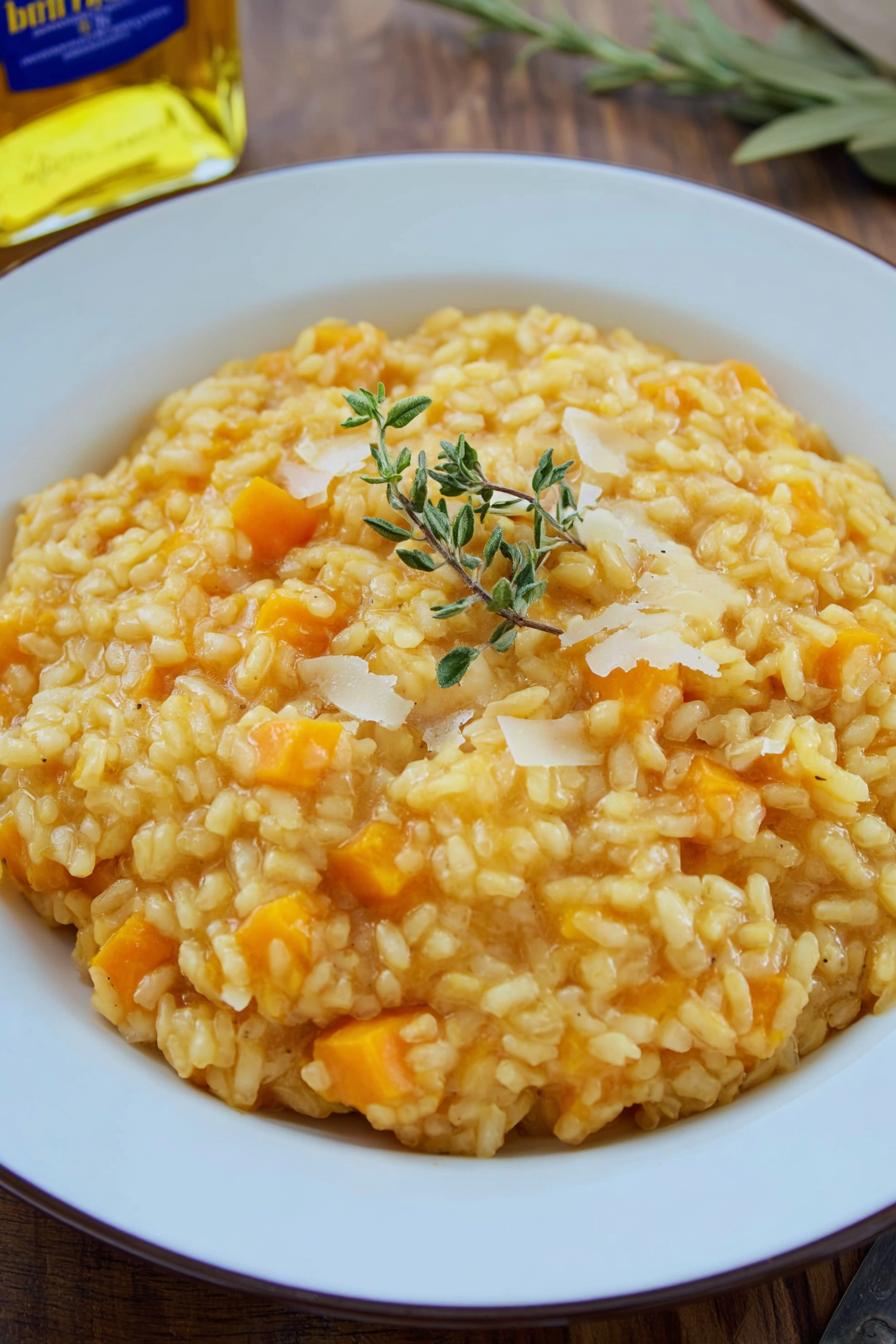 Risoto cremoso feito com abóbora cabotiá assada e vinho branco de cozinha. Combina o toque adocicado da abóbora com a acidez sutil do vinho, trazendo equilíbrio. Usa arroz Arborio para aquela textura típica do risoto e inclui tomilho fresco para aroma herbal marcante. Troquei caldo de frango por caldo de legumes para manter versatilidade e veganização. A manteiga é substituída parcialmente por azeite, diminuindo gordura sem perder cremosidade. Técnicas de cozimento e ordem das etapas ajustadas para poupar tempo e garantir textura. Ideal para meses mais frios, prato reconfortante com toques sofisticados. Serve 6 e leva cerca de 45 minutos no total.