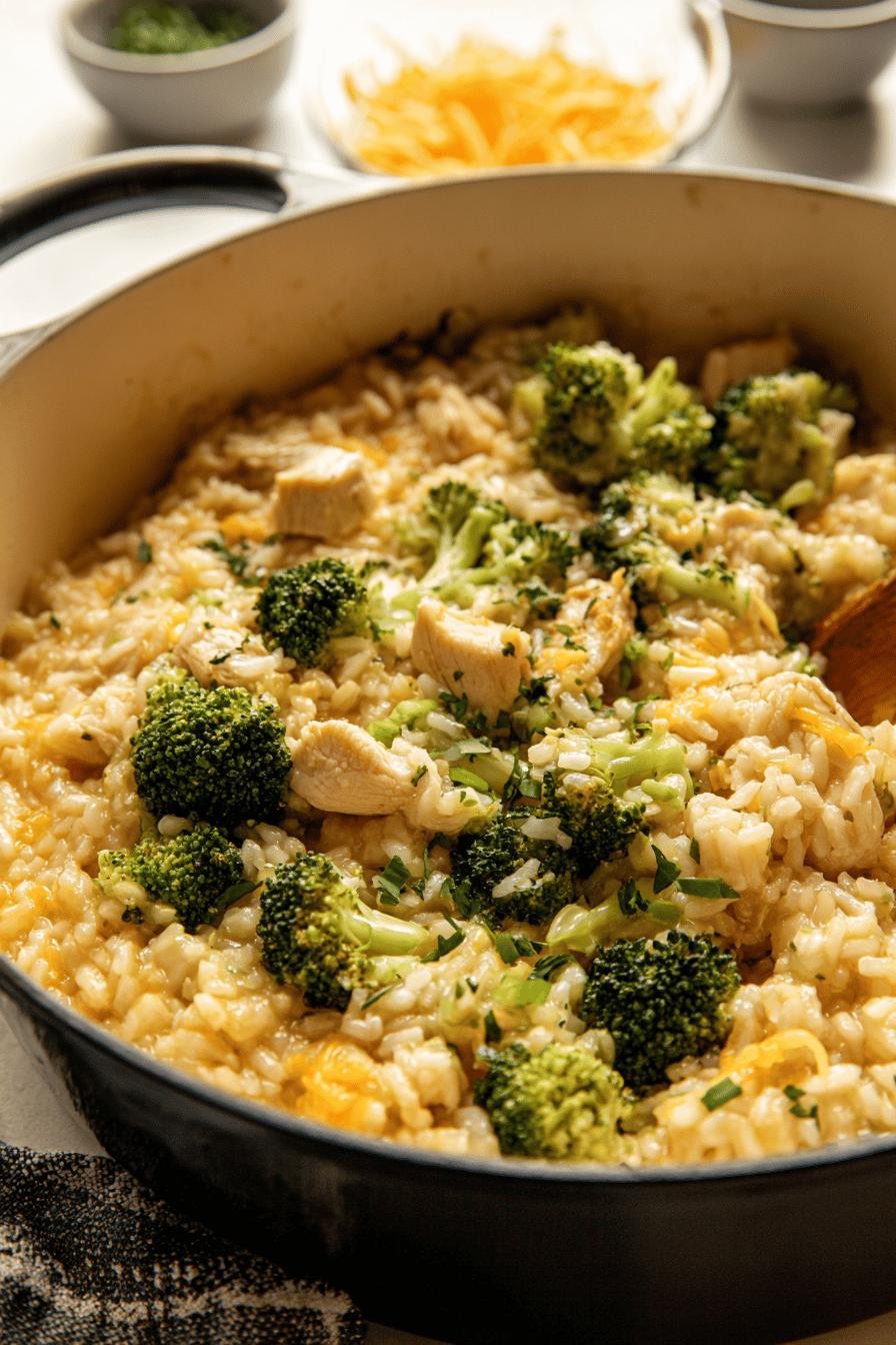 Risoto cremoso com pedaços de frango dourado e brócolis assado, preparado com arroz arborio e caldo aquecido. Passo a passo aborda controle de temperatura, tempos flexíveis e dicas para textura al dente. Substituição de parmesão por queijo meia-cura para toque regional. Técnicas detalhadas para refogar, assar e controlar a hidratação do arroz. Receita feita para 6 porções, ideal para almoço em família, com foco na textura e aroma. Ensinando também quando parar e ajustar o caldo, além de truques para evitar arroz empapado. Uma abordagem prática para resultados consistentes.