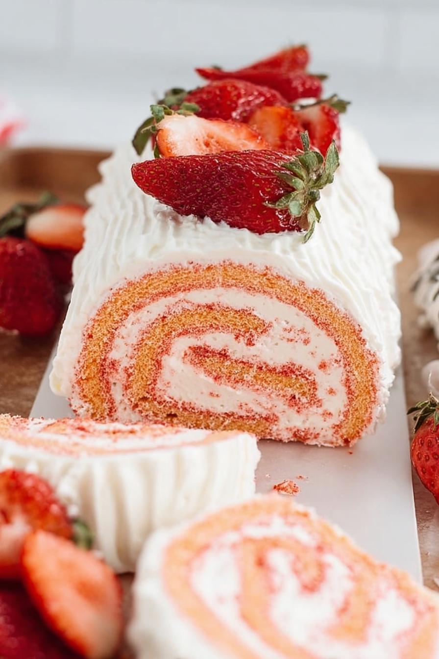 Bolo enrolado com massa ajustada com farinha de trigo integral e trocando óleo por manteiga derretida. Aromatizado com essência natural de baunilha além do morango, e colorido com suco concentrado de beterraba para evitar corantes artificiais. Recheio com cream cheese, açúcar demerara e chantilly caseiro feito com creme de leite fresco gelado. Técnica de enrolar com pano polvilhado de açúcar de confeiteiro para evitar grudar e fissuras. Assado em forno preaquecido, usando sinais visuais como leve dourado e toque firme, evita bolo ressecado e rachado. Refrigeração importante para firmeza e manter a forma na hora do corte. Serve 10 pessoas.