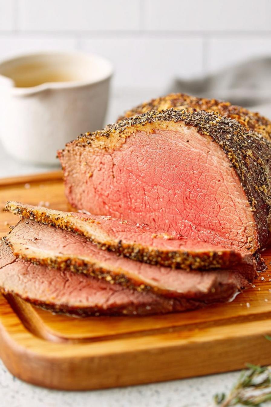 Maminha suculenta, baixa temperatura, sabor com ervas e cebola. Técnica para crosta uniforme, carne macia e suculenta. Tempero simples com alho, tomilho, alecrim, sal e pimenta. Dica pra evitar ressecamento, uso de cebola para elevação na panela, líquido para manter umidade. Tempo ajustado conforme tamanho, teste com termômetro, descanso fundamental pra carne fatiada fina, macia e suculenta.