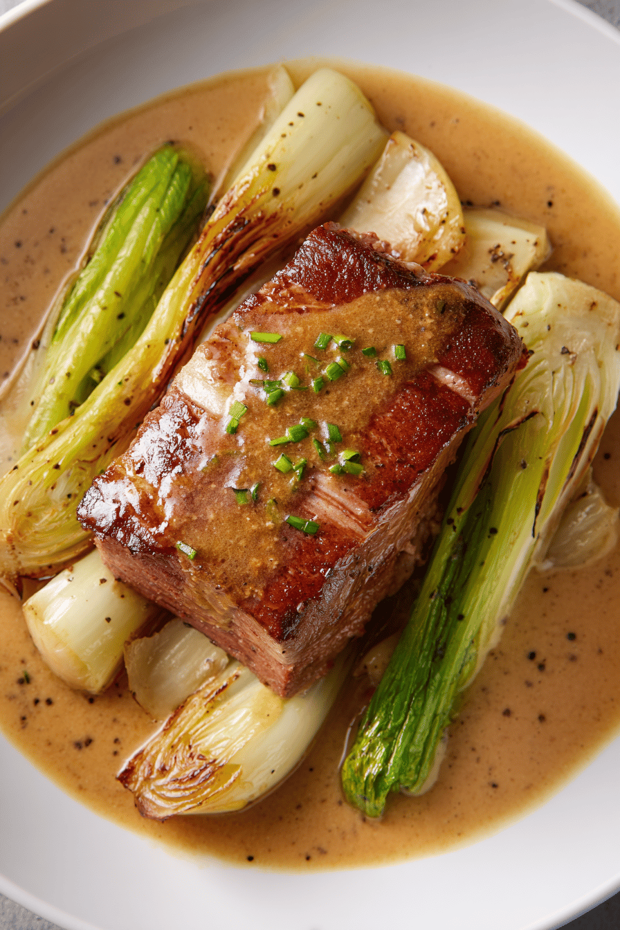 Carne de vitela assada com toque rústico de mostarda antiga e alho poró cremoso. Substituto do creme tradicional, uso leite de coco para suavizar a textura e deixar um sabor inesperado; farinha de arroz substitui a trigo, evitando grumos e deixando o molho mais leve. A técnica de dourar na frigideira que vai ao forno garante aquela crosta crocante e interior suculento. O ponto certo do assado? Quando a carne ainda está rosada, e o alho poró, quase caramelizado, libera o aroma doce junto do perfume da mostarda. Um cozimento feito no forno com atenção ao som da carne, aroma no ar e toque final na textura do molho.
