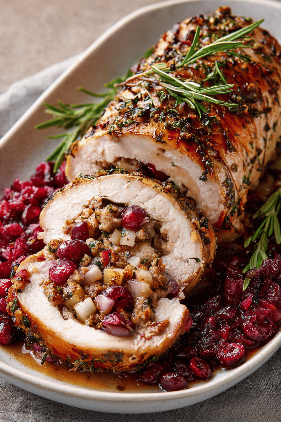 Rôti de peito de peru recheado com pêras e cranberries, cozido na medida certa, com farofa suculenta de porco e toque de vinho branco. Sem lactose, ovos e nozes. Técnicas para dourar e manter suculência, além de dicas para usar sobras e substituições de ingredientes. Receita com desafios na textura do recheio e cuidado no ponto da carne. Perfeito para quem gosta de prato principal robusto, com aroma frutado e crocância na farofa.