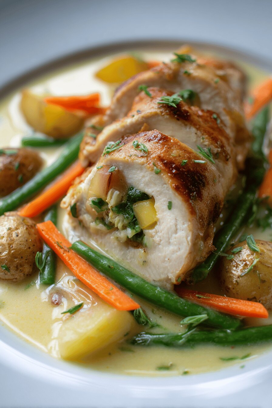Rodelas de frango recheadas com legumes da estação, cozidos al dente, enroladas e douradas na frigideira. Molho emulsificado com vinho branco e vinagre, manteiga fria para textura aveludada. Legumes variados: batata bolinha, cenoura, alho-poró, e substituição do páprica por abóbora e vagem verde fresca. Receita sem glúten, lactose, ovos e nozes, feita para quatro porções generosas, ótima para prato principal na época de outono. Técnicas de preparo e truques para manter suculência do frango e textura dos legumes.