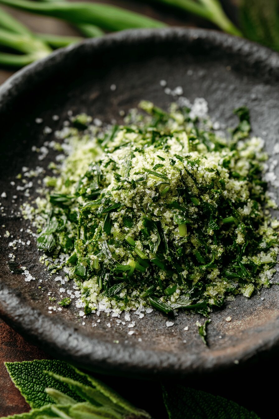 - 💡 Use flores de alho frescas ou secas. Aroma intenso. Tente colher de um local confiável. Sal tem que ser grosso! Não use sal fino. Textura é chave. Moer bem as ervas, mas não até virar pasta. Pulsar no processador. Raspar as laterais ajuda. Assim, mistura fica uniforme. Se não tiver flores, troque por outra erva com sabor suave.