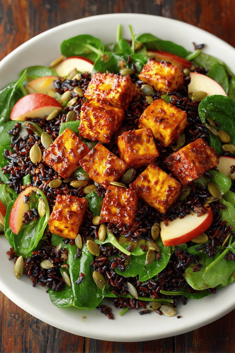 Arroz negro cozido até absorver toda água, combinado com tofu caramelizado e cenouras ligeiramente douradas. Toques de maçã crocante, espinafre fresco e sementes de abóbora torradas completam o prato. Vinagre de maçã, mel e curry equilibram sabores com doçura e leve acidez, enquanto cebolinha fresca traz aroma marcante. Sem glúten, lactose, ovos ou nozes. Texturas variadas, do arroz denso ao tofu macio, enriquecem a experiência. Ajustes simples permitem substituir ingredientes sem perder a essência.