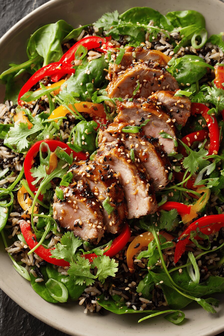 Salada que joga arroz selvagem, porco grelhado, pimentões e amendoim numa mistura crocante com toque cítrico do vinagre. Fácil, versátil e cheia de texturas que vão do crocante ao macio. Variações na marinada, substituição das coberturas e molho fazem toda diferença para ajustar ao gosto ou o que tem na geladeira. Porco bem selado, arroz soltinho com grãos levemente abertos, combinação vibrante de sabores e ingrediente surpresa para deixar interessante. Prato que pode ser entrada ou prato leve, que combina bem com dias quentes, mas se adapta frio também.